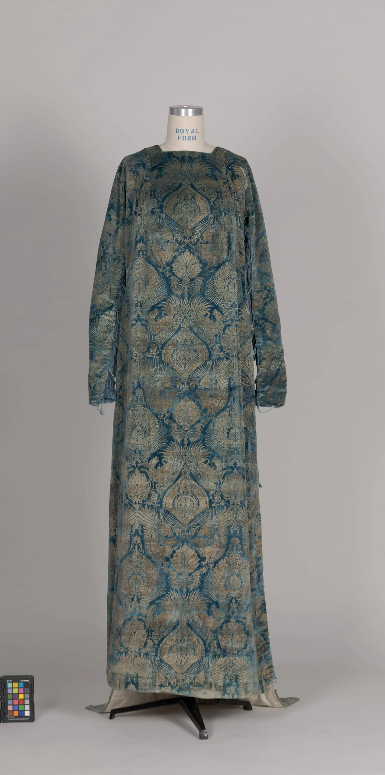 - Silk velvet, hand-stencil printed, with silk plain weave, pleated, silk cord and murano glass beads