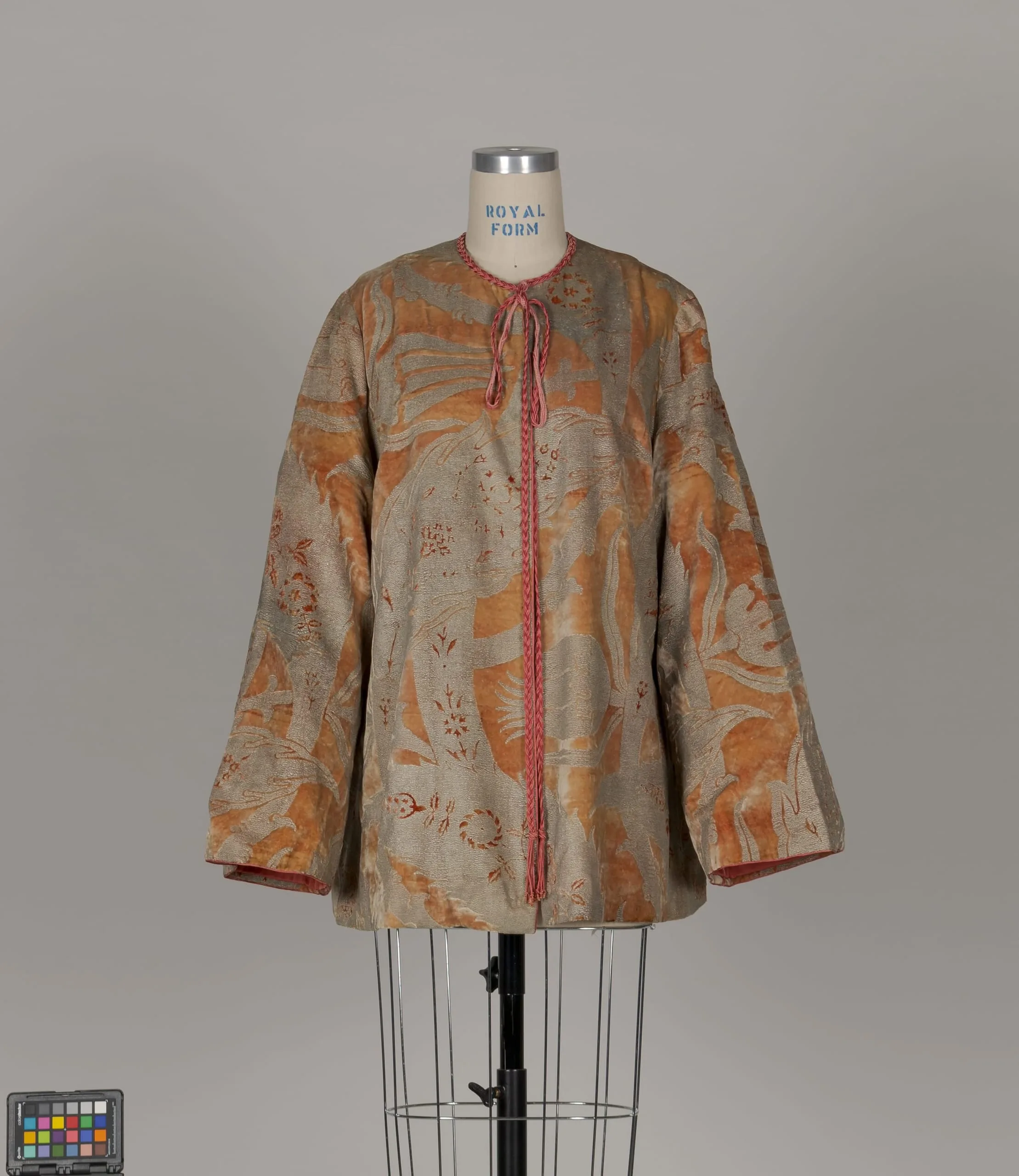 Loose hip-length jacket with dramatically flared sleeves displayed on a dress form, made from amber, sage, and rose brocade fabric with large floral motifs and braided cord trim