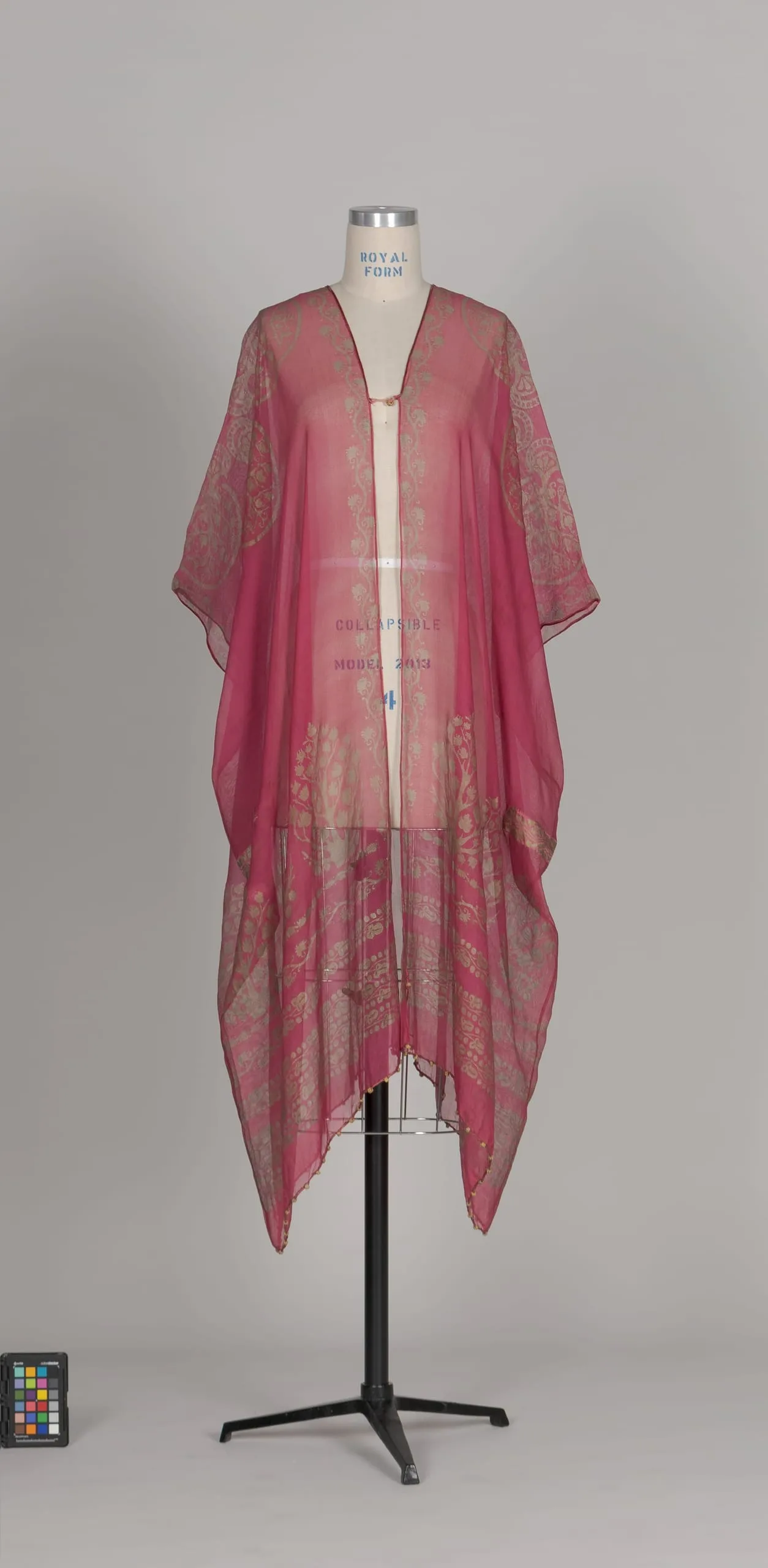 - Silk gauze weave, hand-stencil printed, with silk satin hand-stencil-printed appliqué, silk satin cord and glass beads