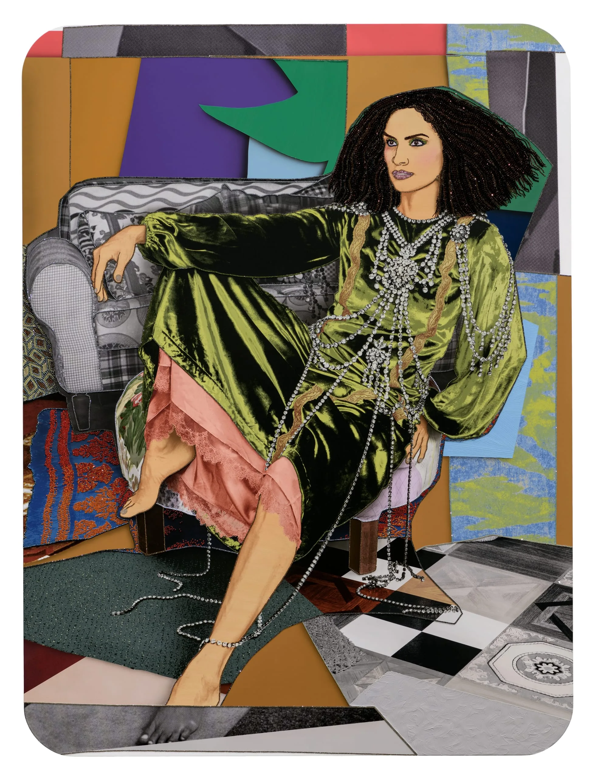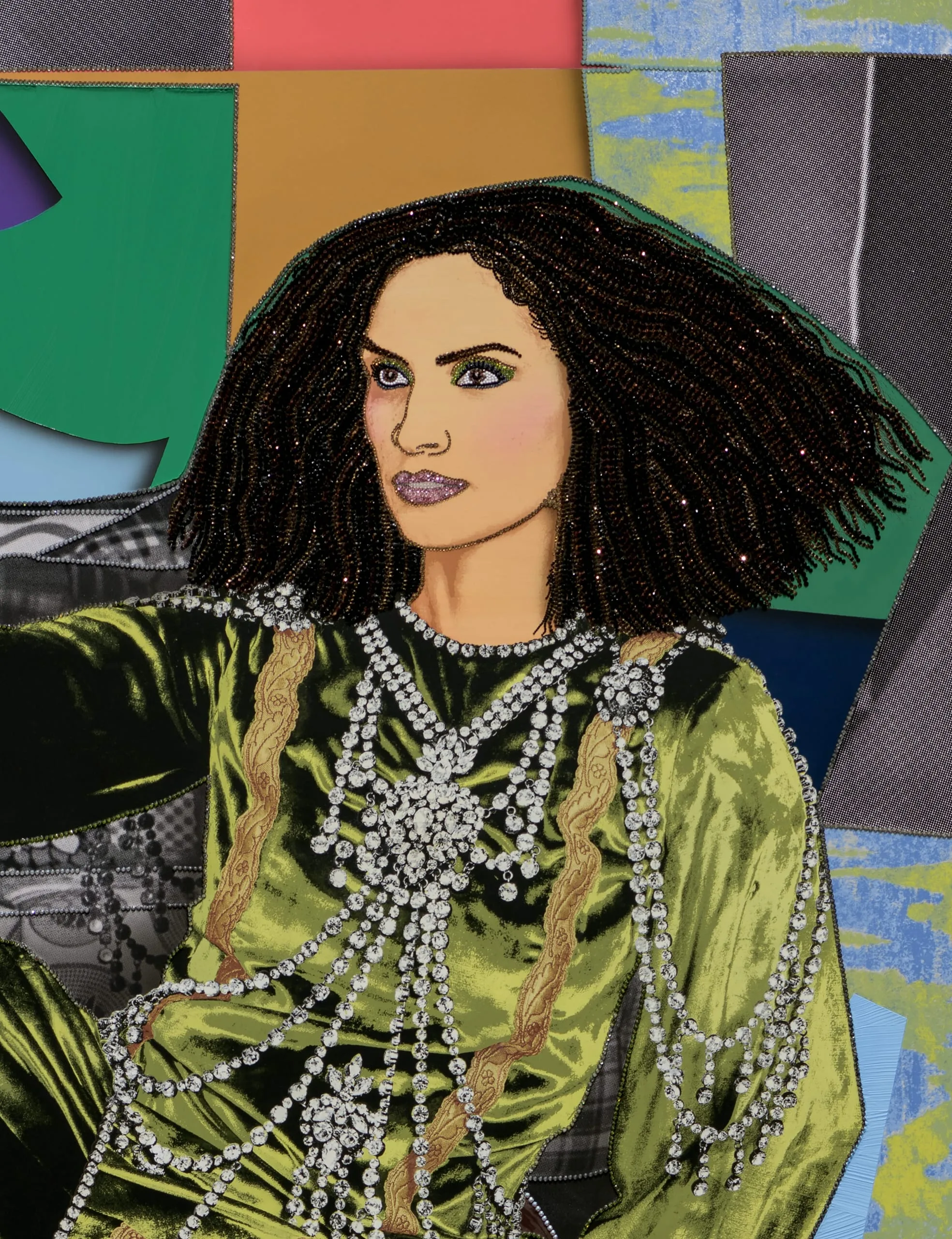 - Rhinestones, acrylic and oil paint on canvas mounted on wood panel