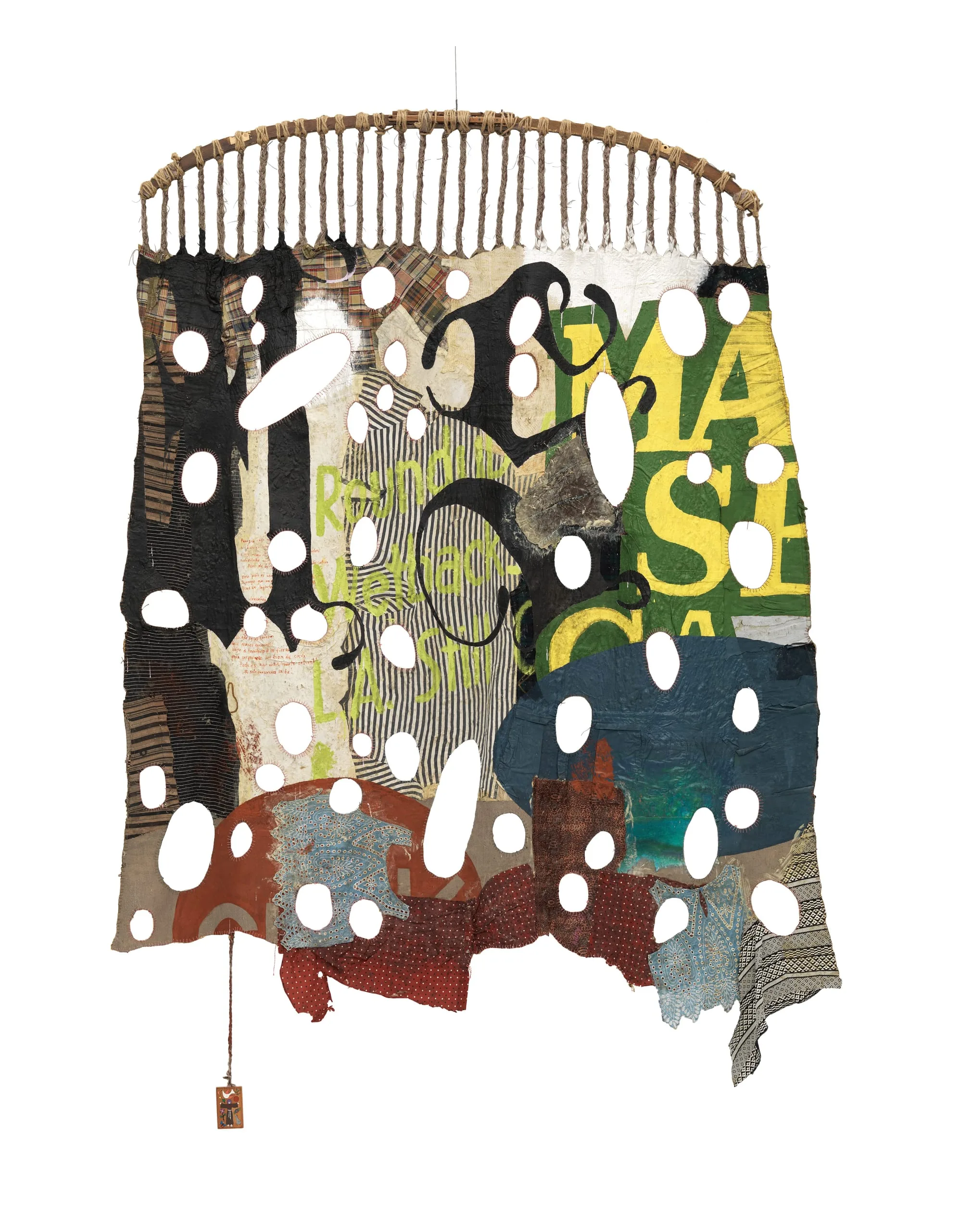 - Cast rubber with oak tree surface residues and found upholstery; latex paint, acrylic, and marker on found cloth; found object; twine; and wooden support
