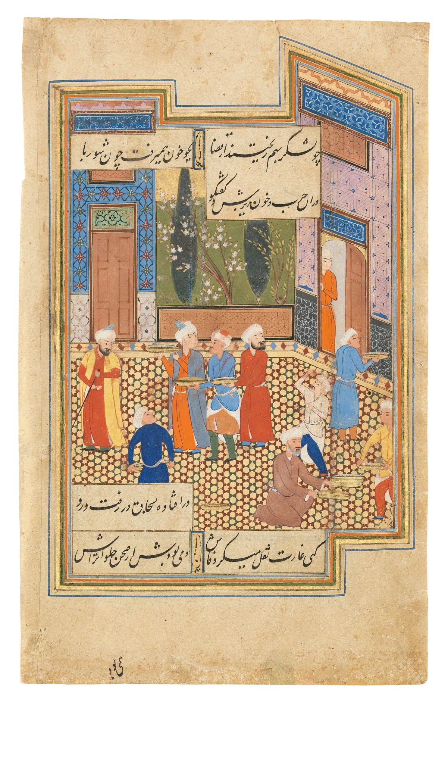 Attesting to the widespread popularity and longevity of Bushaq’s food poetry, this late 16th-century painting is a detached folio from an otherwise unknown illustrated version of his collected works. It does not reflect the accompanying text but rather suggests the outcome of putting the verse into practice by preparing a meal. The figure in white, wearing an apron and wielding a red stick to hurry along the servers, is probably the bavarchi (chef), while the figure in the yellow robe is likely the sufrachi, or table steward.