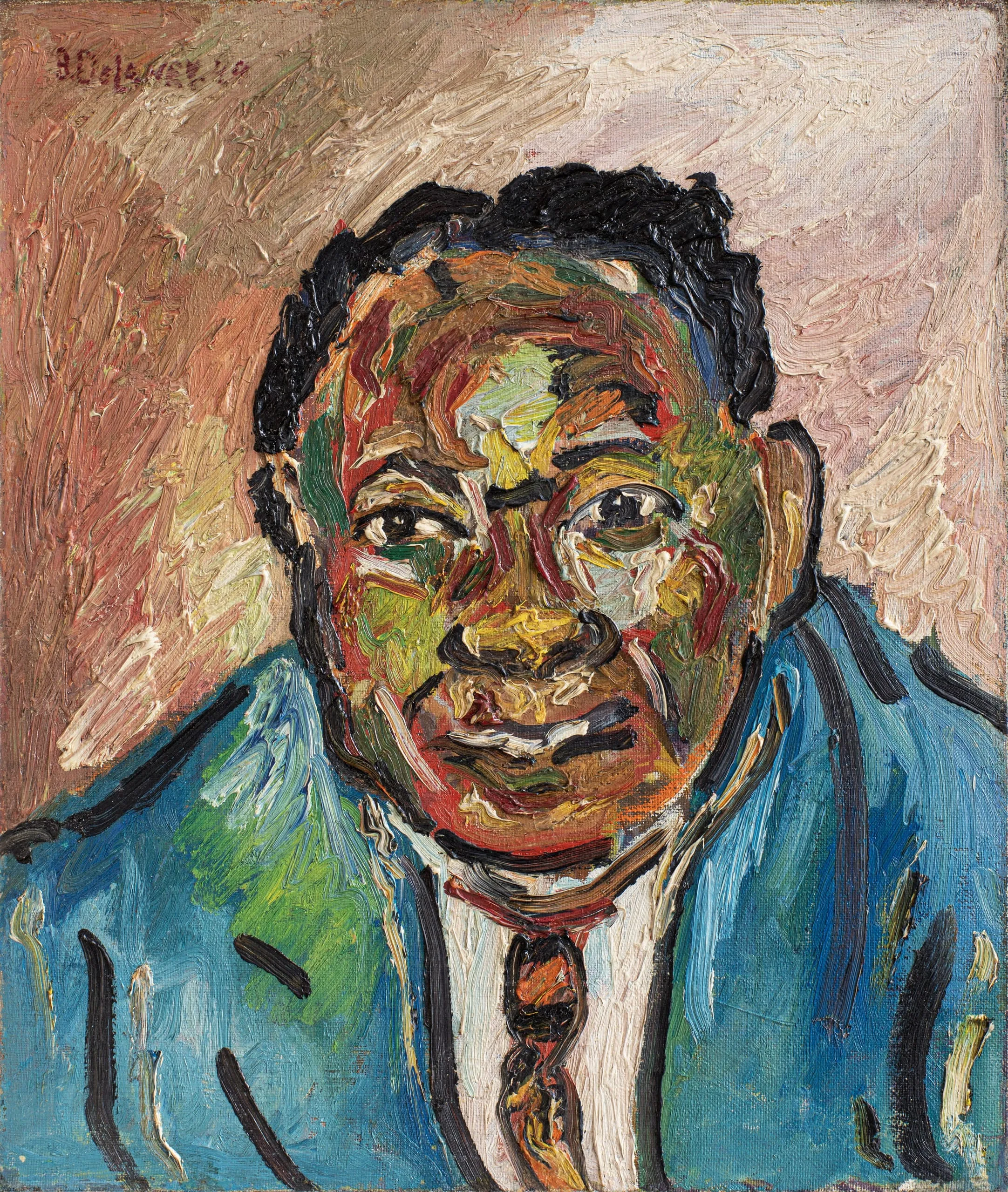 Delaney renders his friend McKay’s pensive countenance with colorful, thick, expressive brushstrokes that delineate the contours and shadows of his face. Dressed in a bright blue jacket, McKay gazes directly at us; his upper torso fills the canvas, suggesting his powerful presence. Stylistically, the thick brushwork and intense colors reveal Delaney’s appreciation for Van Gogh and the French Fauves. Working from both direct observation and memory, Delaney’s psychologically engrossing portrait captures his sitter’s temperament through details of clothing and expression, set against a textured abstract background.