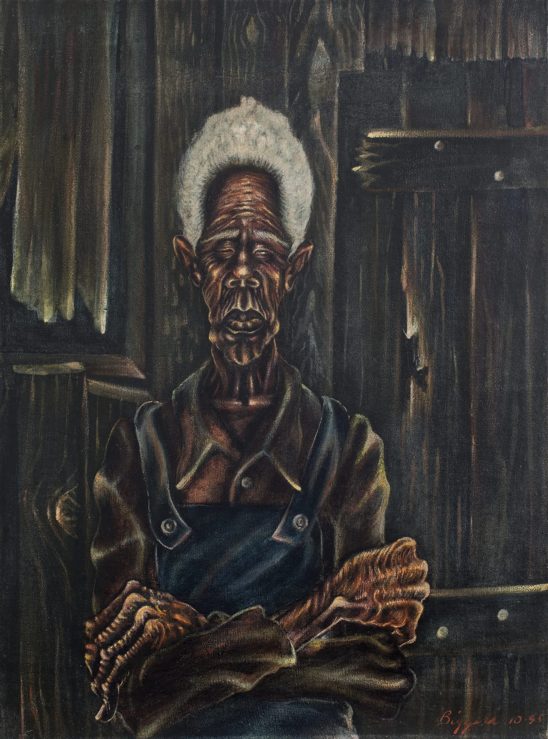 Here Biggers focuses on sharecropping, a farming system that emerged in the South after the Civil War and lasted until the 1940s,. Under the system formerly enslaved African Americans and their descendants worked fields belonging to primarily white landowners, preventing them from acquiring capital and and land of their own. The solitary sharecropper conveys both exhaustion and strength: although his faced is lined and his hands gnarled, his posture is erect and he appears almost saint-like, with closed eyes and white hair framing his head like a halo. The somber palette and contrast between wood, hair, skin, and clothing all contribute to the subdued mood of the painting. The splintered wood backdrop represents a shotgun house, a recurring motif that Biggers used in his work.