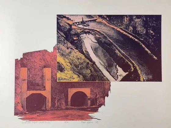 Horizontal print combining two overlapping photographic images: an aerial view of a mountain pass in purple and gray tones, and a coral-red building facade with two large arched tunnel openings