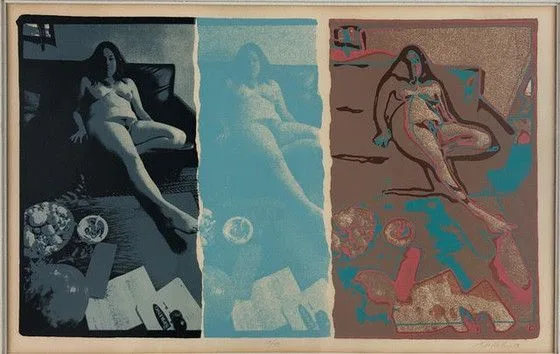 Screenprint triptych of three panels, each showing a nude reclining woman: dark teal photorealistic left panel, pale blue middle panel, and loose gestural right panel in tan, coral-red, and teal