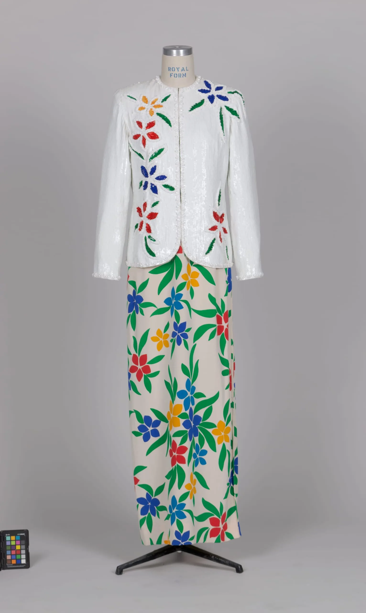 - Jacket: Silk plain weave and plastic sequins; Dress: Silk plain weave (crepe), printed