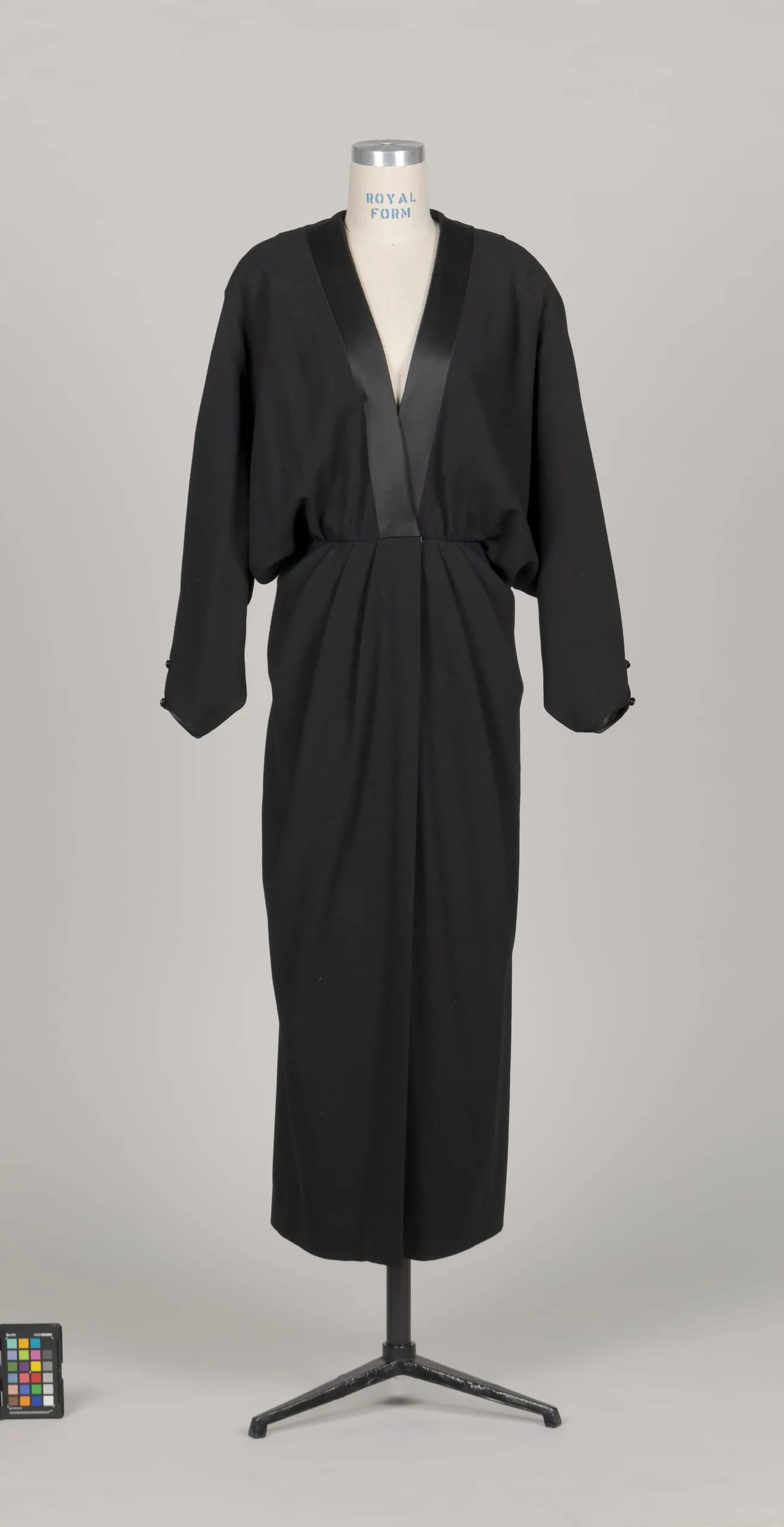 - Dress: Wool plain weave (crepe) and silk satin; Belt: silk satin and vinyl