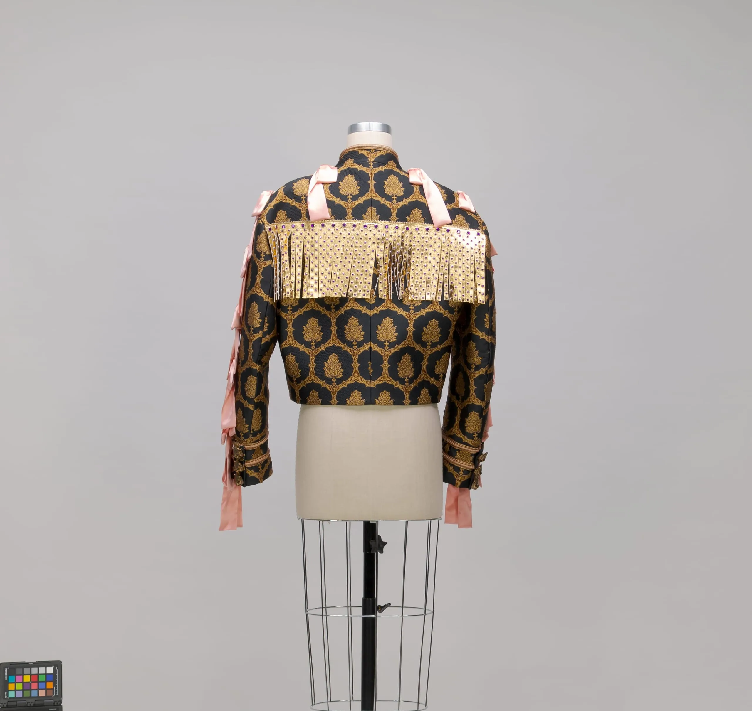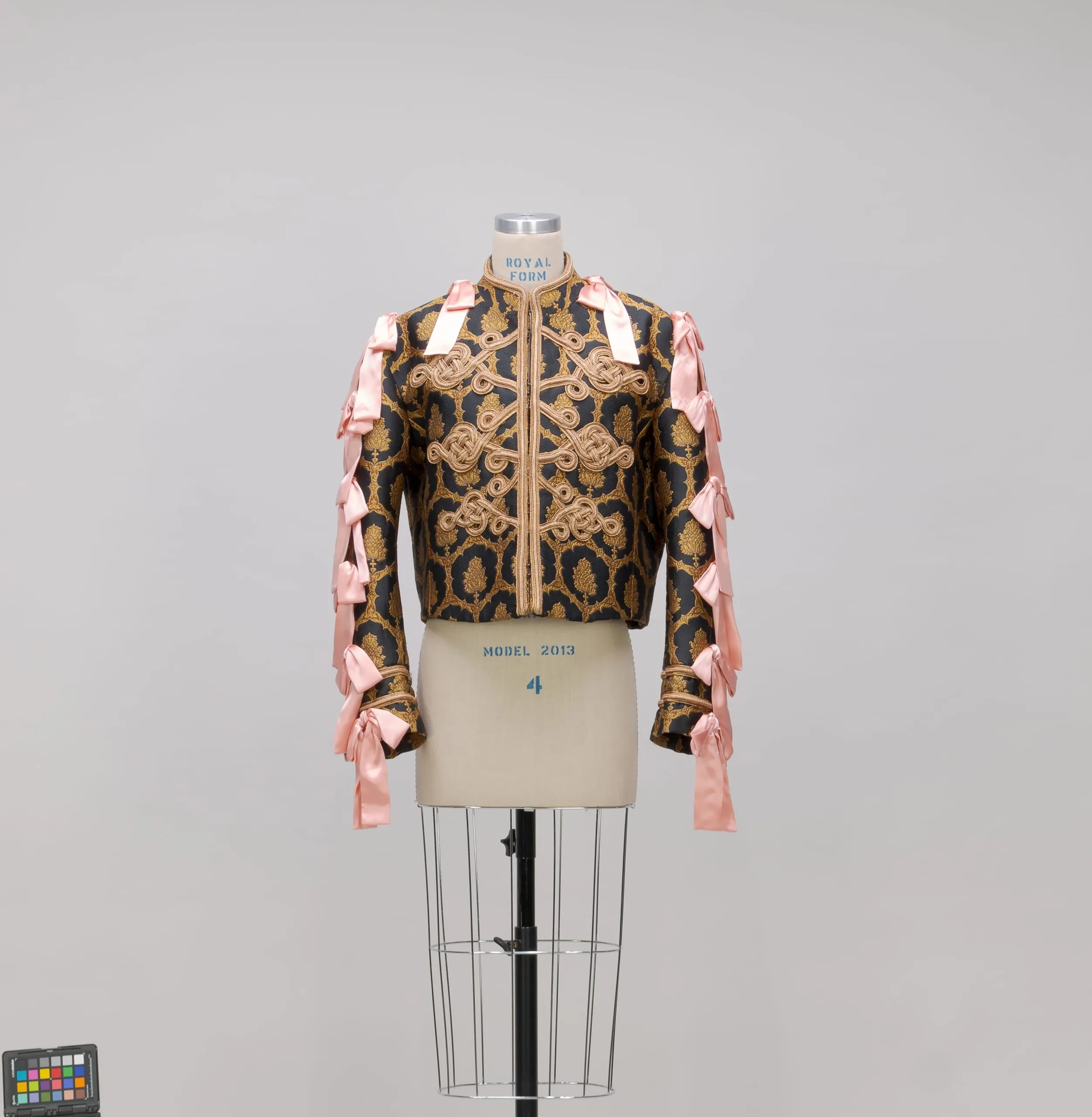 - Polyester, acrylic, silk, and wool twill weave with supplementary-weft pattering bound in twill with metallic thread braid and silk satin trim