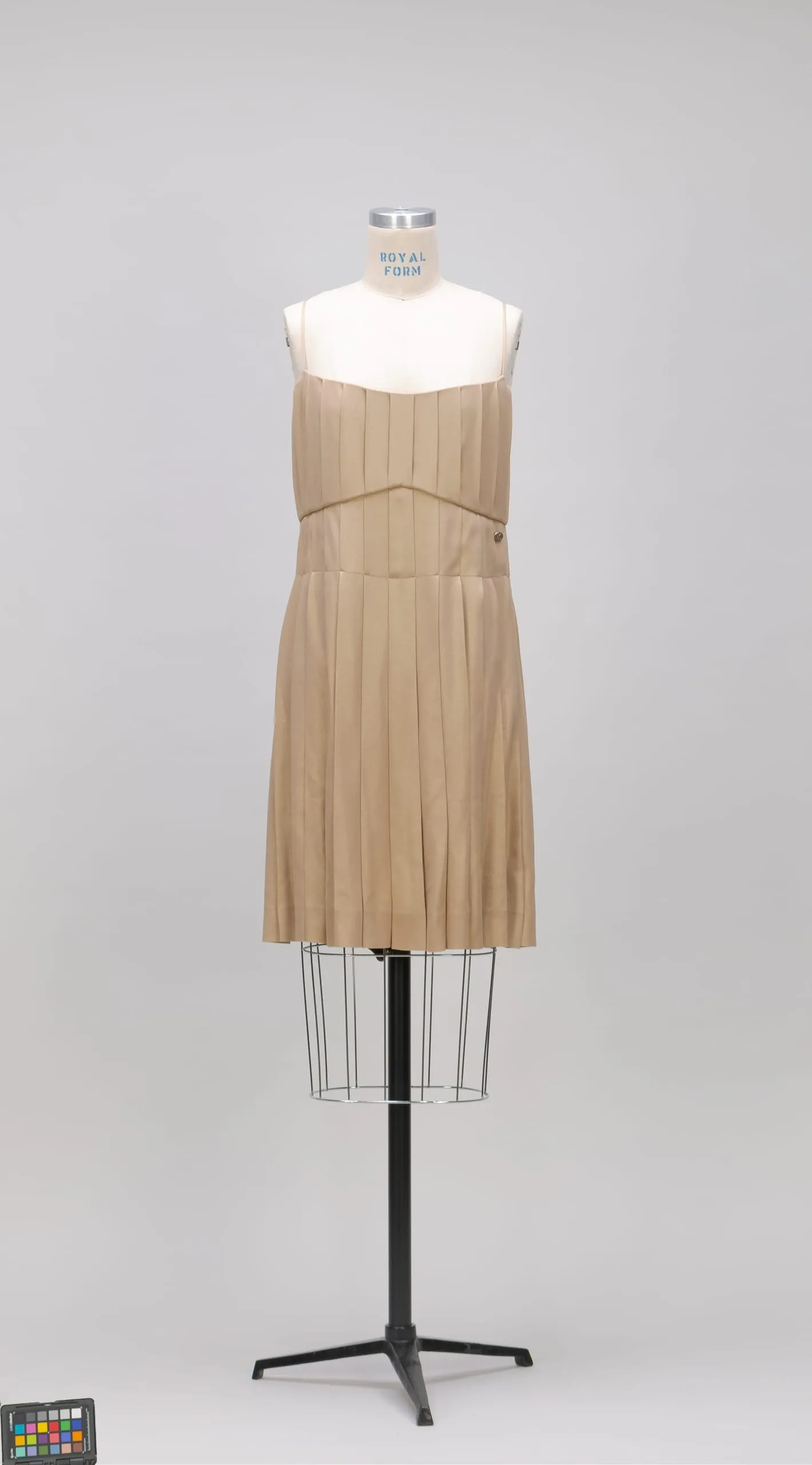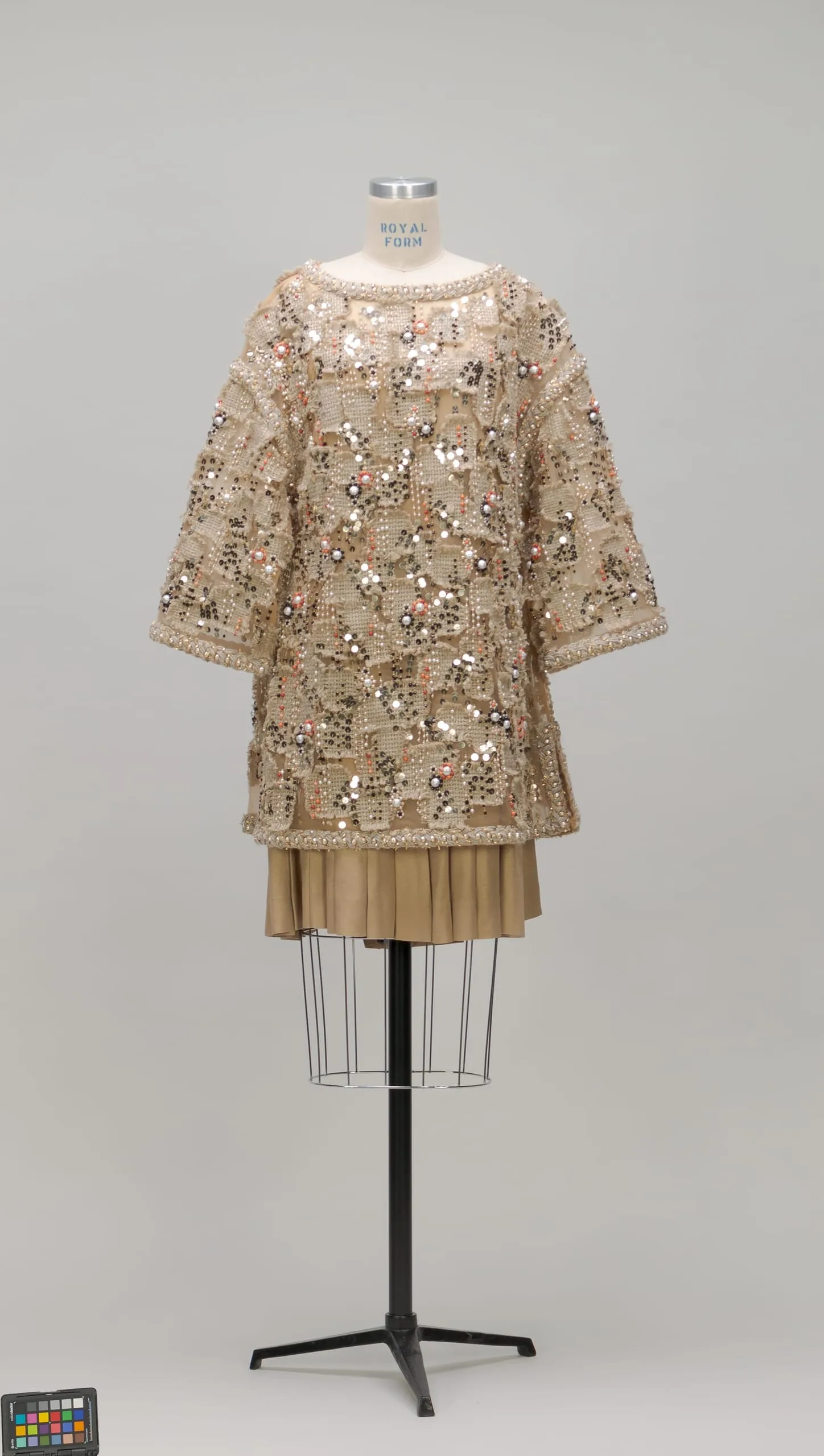 - a) Tunic: Silk net with linen plain weave appliqués, with glass beads and plastic beads, plastic sequins and faux pearls; b) Dress: silk crepe