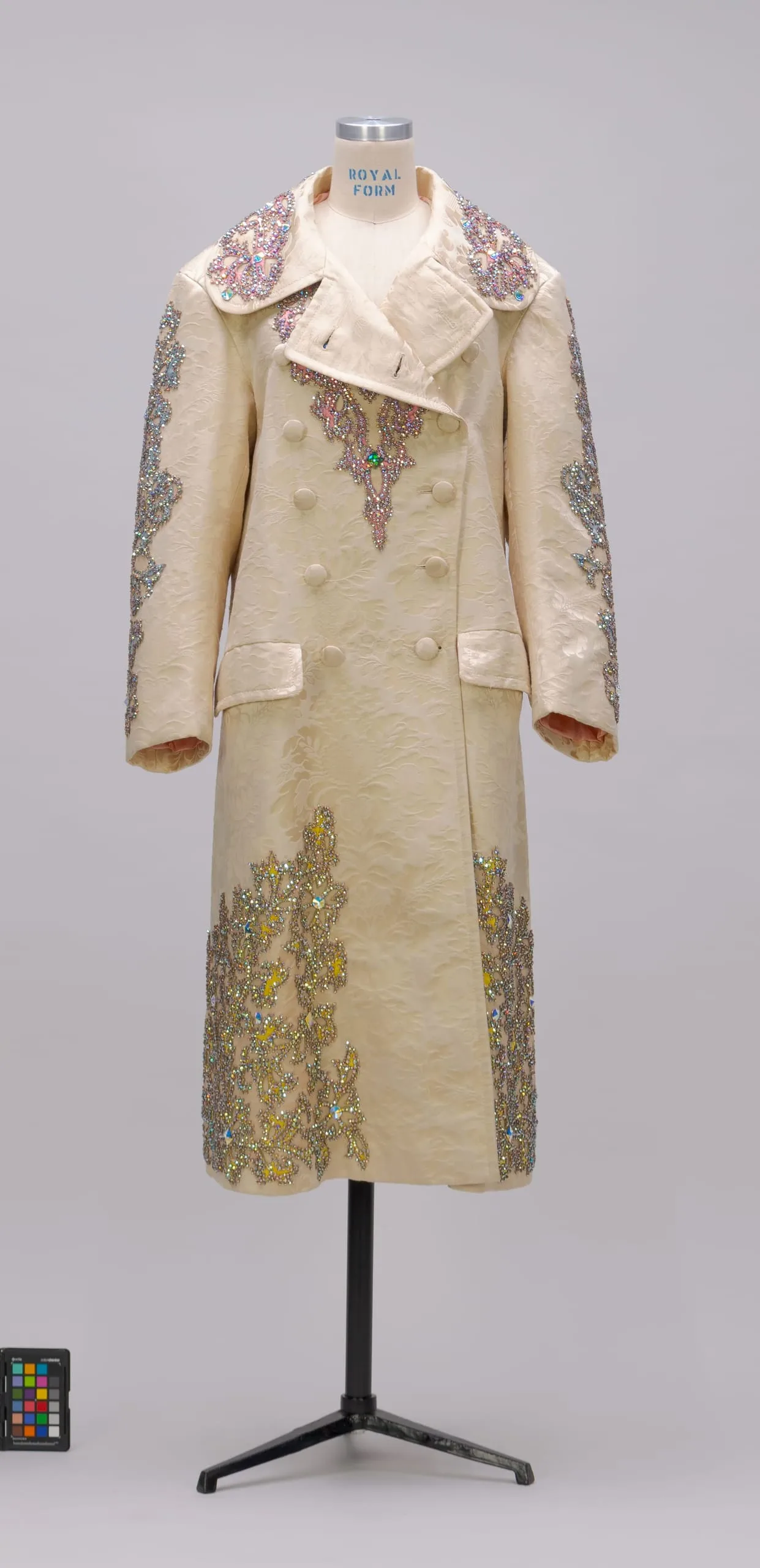- Silk damask with silk twill appliqués and crystals