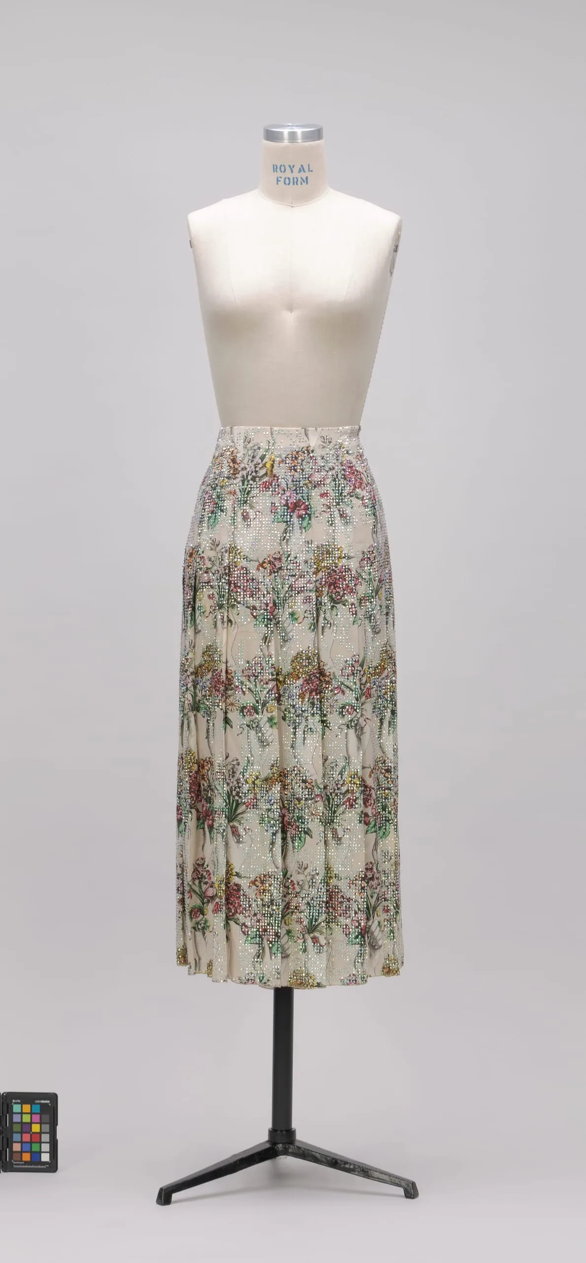 - Silk plain weave (crepe), printed, with crystals
