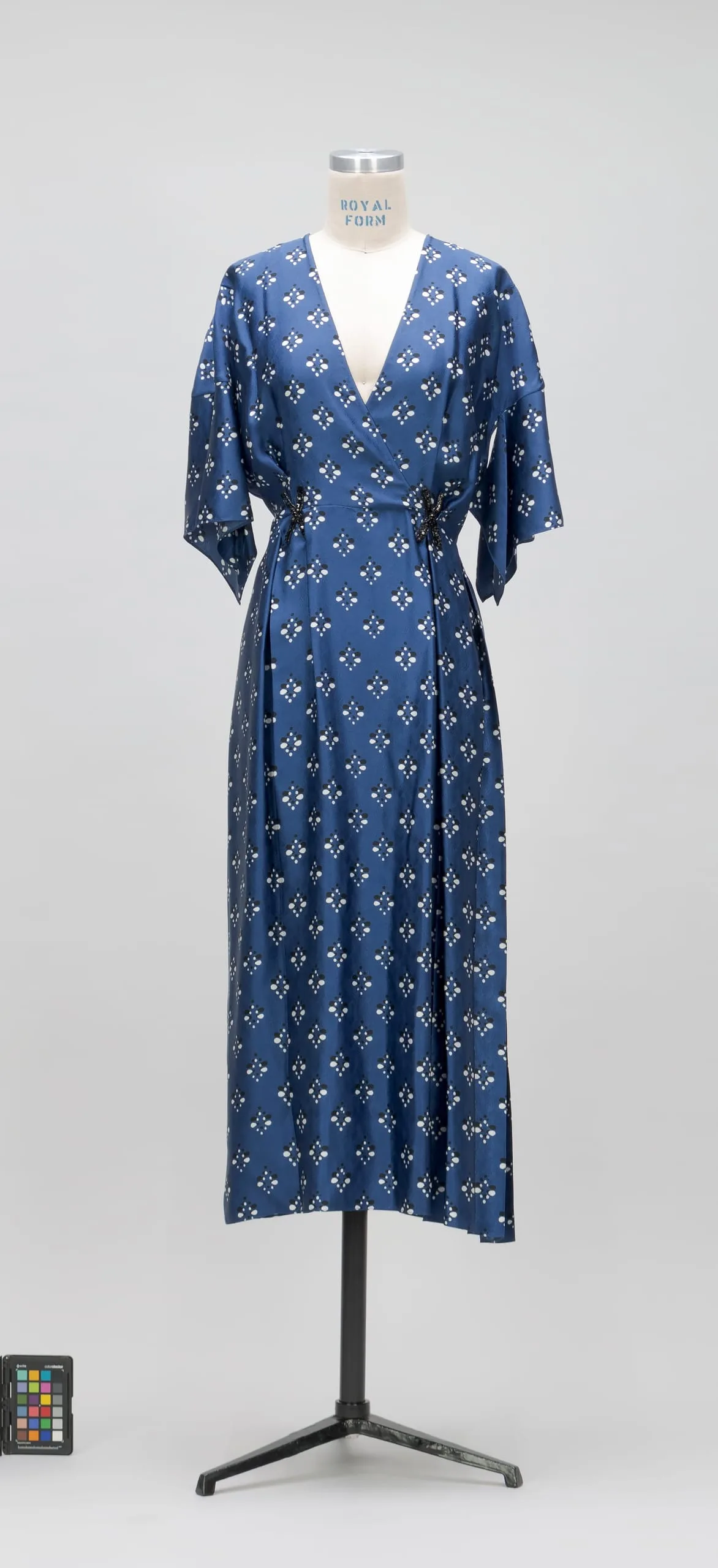 - Silk jacquard weave, printed, with glass bead crystals and appliqués