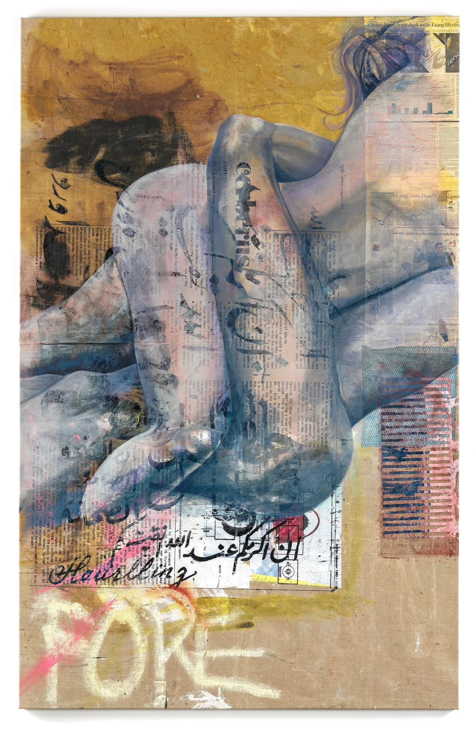 but also ambiguity, as the layering of these elements over far less sensual financial news articles and an advertisement for