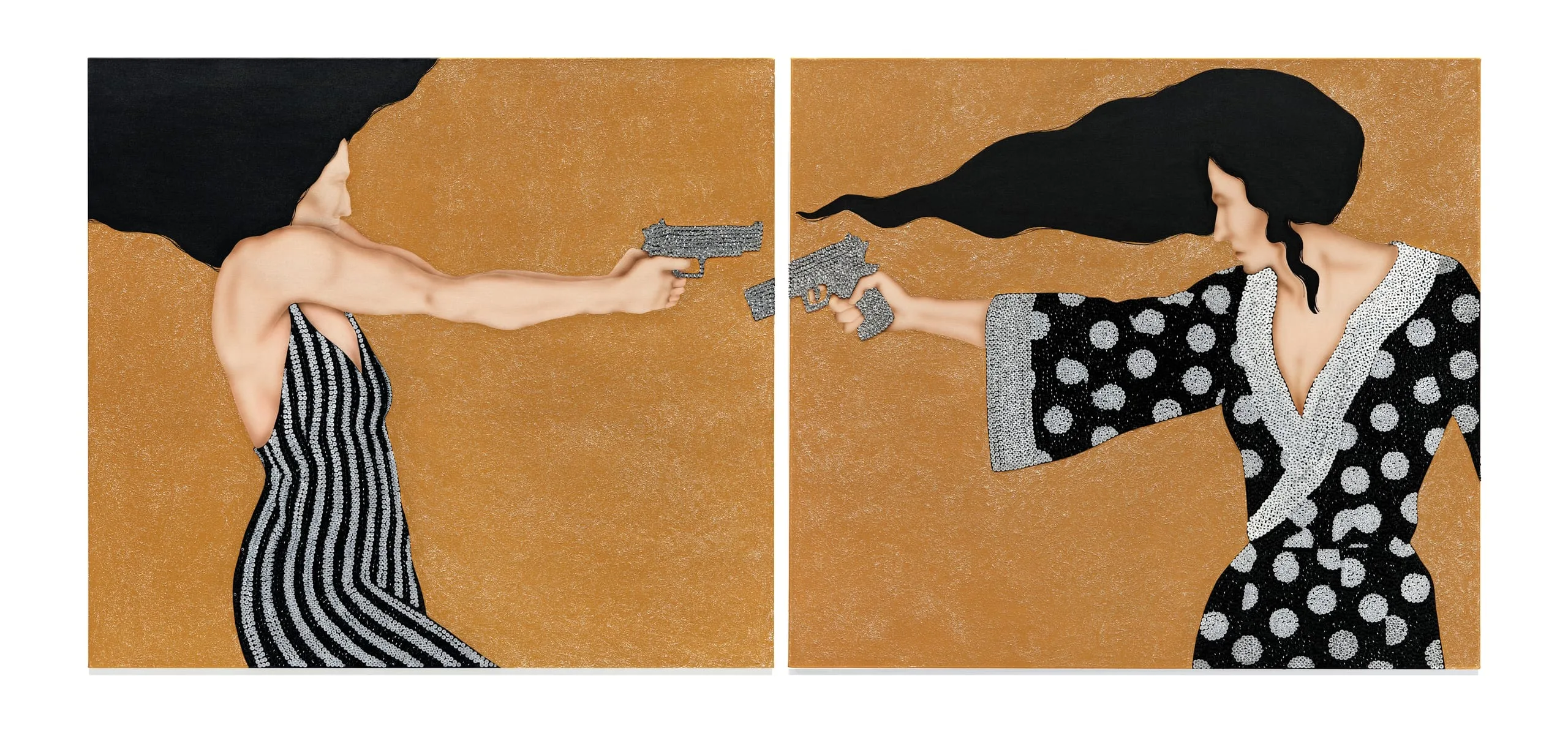 in a threatening atmosphere. Here, a pair of armed, muscular figures in elegant clothes embellished with sequins and beads face