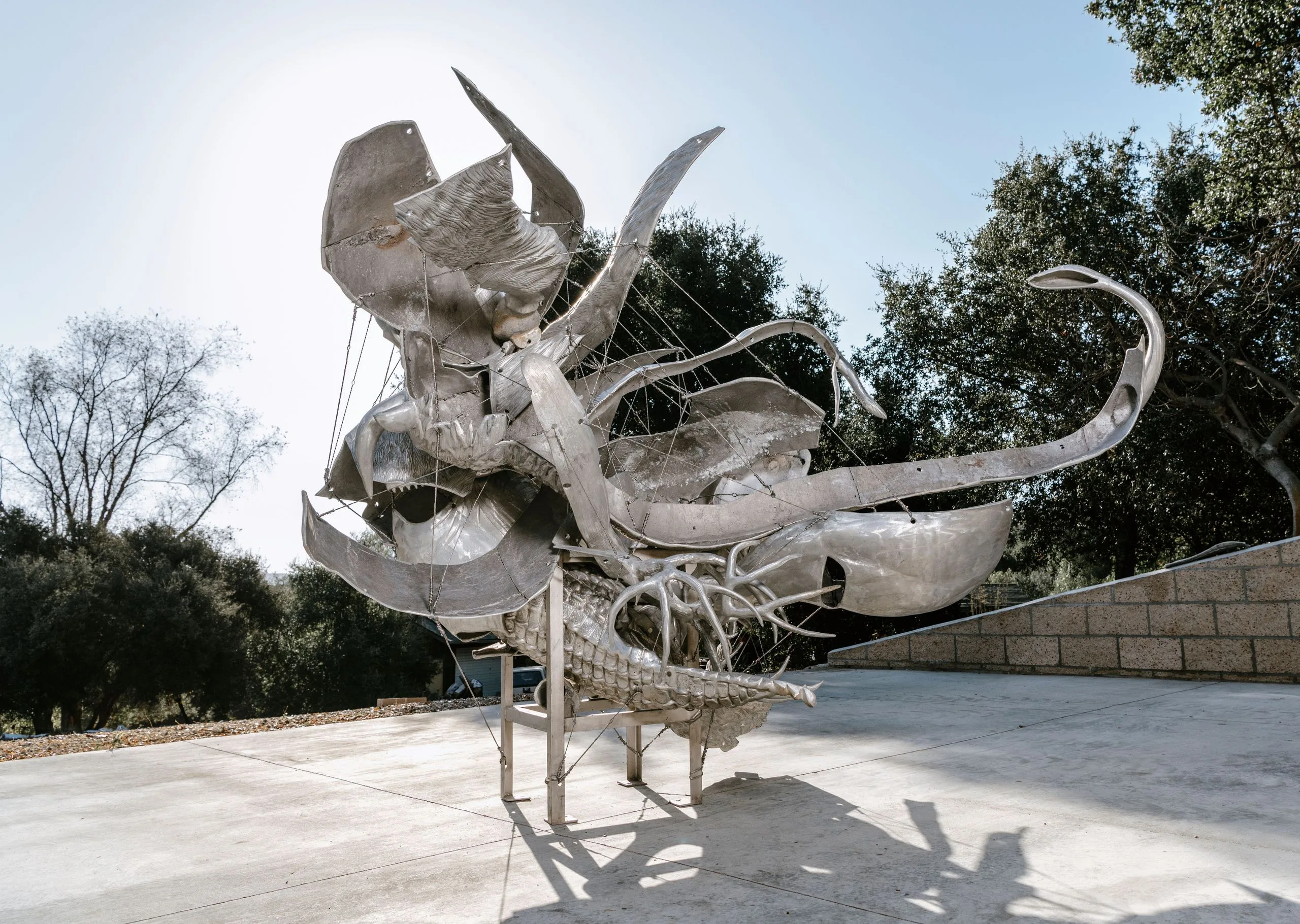 In the Fluid Space series, to which Photon’s Mass belongs, welded metal tables serve as structural supports. Rubins has sliced, cut, and inverted the discarded playground characters, transforming these animals from kitschy, cartoonish figures into commanding formal elements. Some are recycled from previous works, following the cyclical life of metal seen in Rubins’ past use of airplanes, boats, and playground parts. The scale of this body of work is more intimate, compressed, and contained, while retaining the signature tension between expansiveness and limitation. In Photon’s Mass, Rubins weaves and transforms the elements in and around the anchoring table, while the wires connect and balance the cantilevered fragments that have been turned and twisted to reveal their seams, welds, and grind marks.