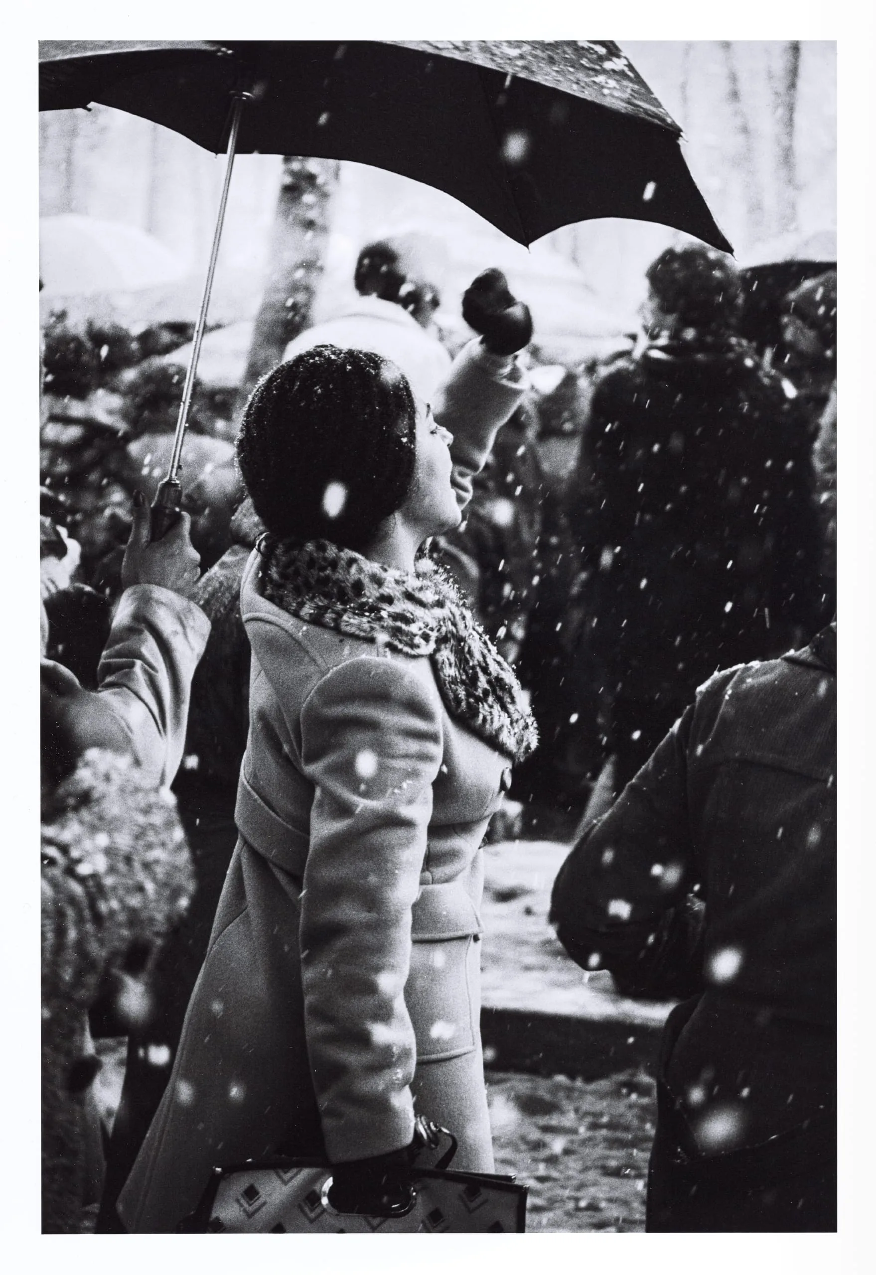 Black and white photograph of a Black woman in a crowd, tilting her head back in falling snow, holding an umbrella and patterned bag, wearing a coat and textured scarf