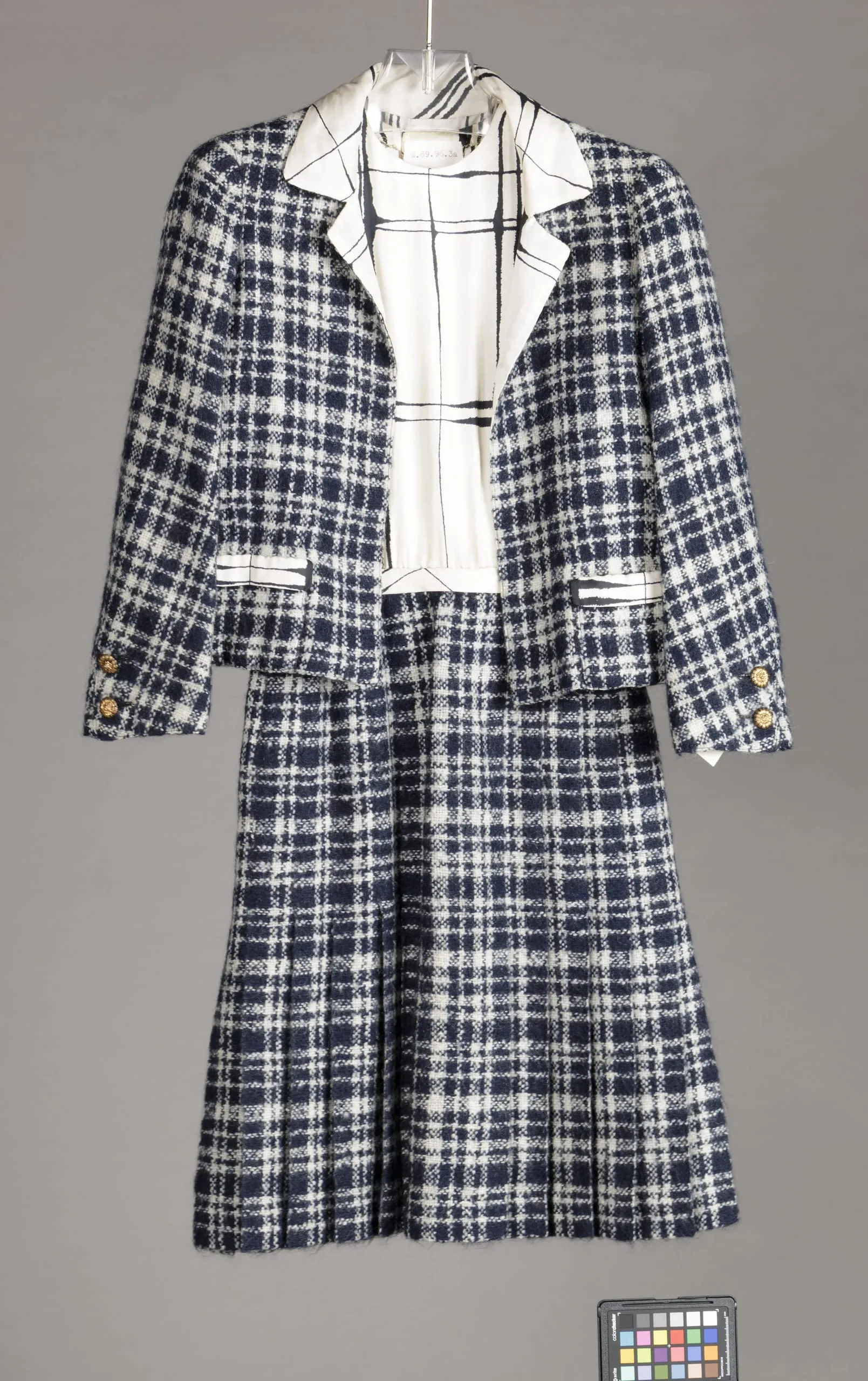 - a) Jacket: wool plain weave, silk twill, printed, metal buttons. b) Dress: Wool plain weave, silk twill, printed.