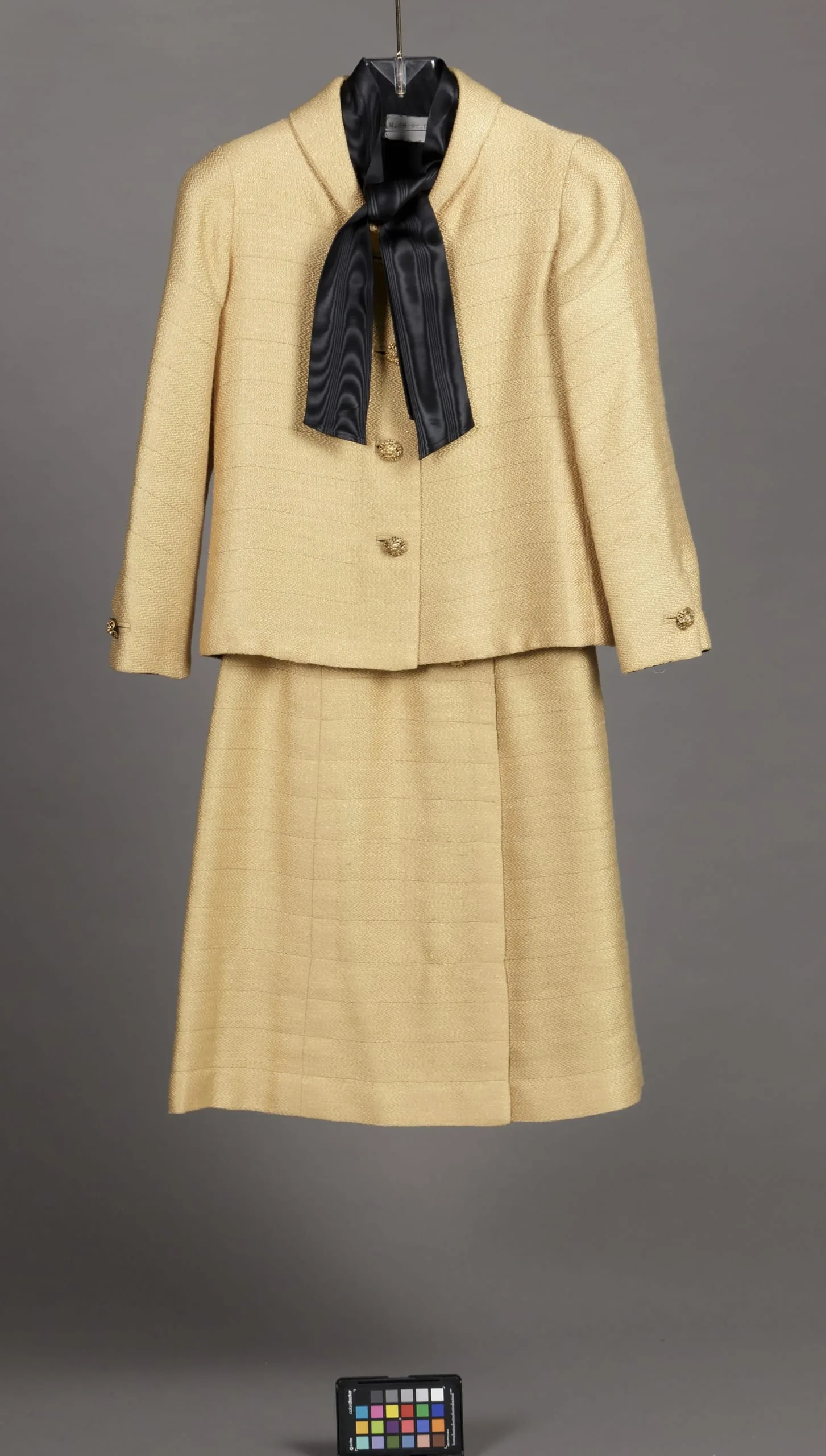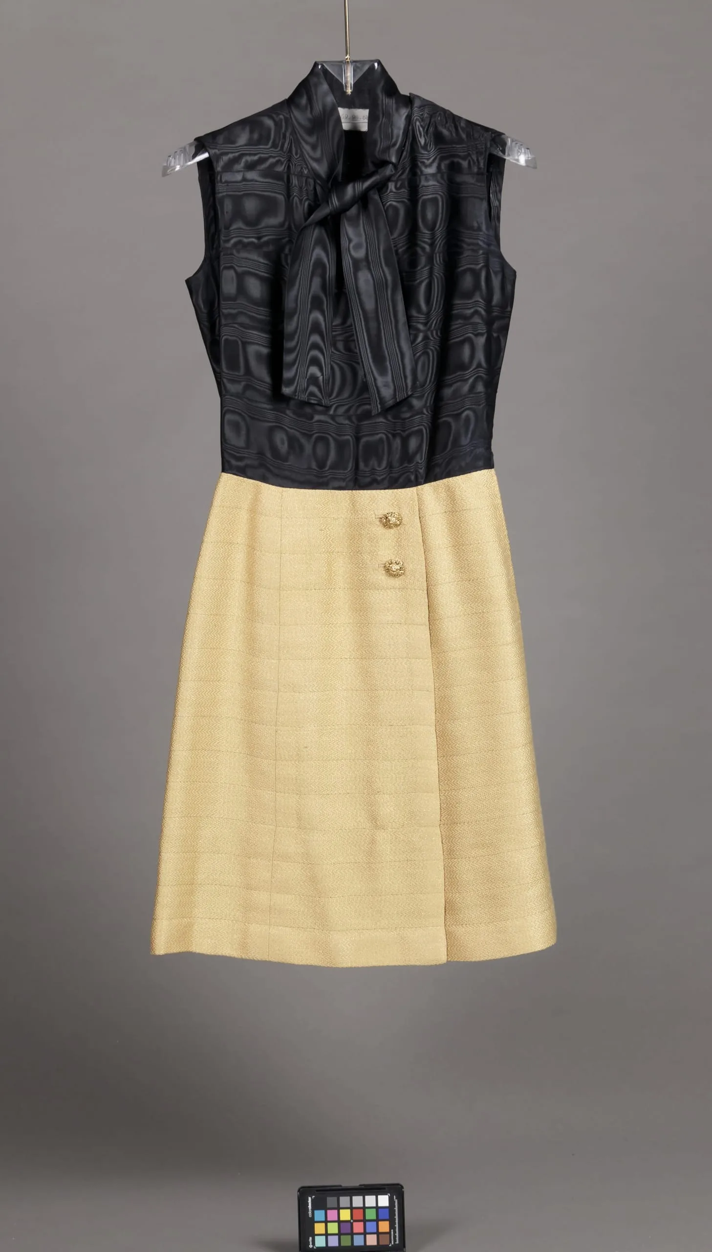 - Jacket: silk and metal thread warp and silk weft twill with gilt metal buttons; Dress: silk and metal thread warp and silk weft twill and silk moire ribbons