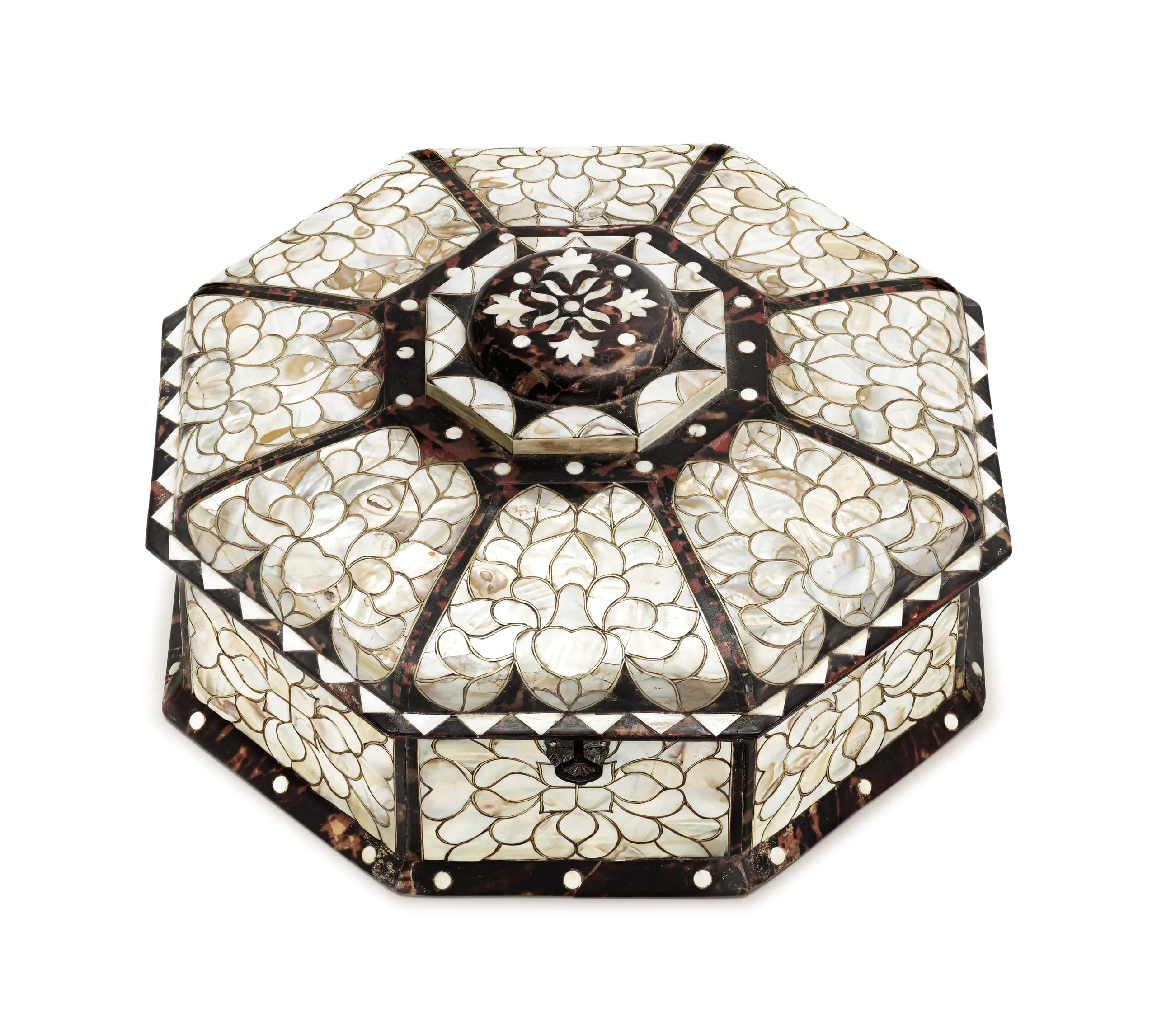 Spanish American furnishings veneered in tortoiseshell and mother-of-pearl designs are known as enconchados. The term derives from the application of small sheets of mother-of-pearl (concha de perla) on wooden surfaces. Because of their materials and decorative schemes, the works have been slippery to categorize. Scholars have suggested that they were imported aboard the famous Manila Galleons that traveled annually to the port of Acapulco in Mexico, from where the objects were distributed throughout Spanish America. Some experts have argued that their profusion in Lima suggests local manufacture, possibly with the involvement of Asian artisans. Archival and material documentation, however, seems to suggest that the works originated in Guatemala City, where mother-of-pearl and tortoiseshell were harvested locally and considered a prized commodity. Many works made of these materials were exported to Mexico and Peru. The designs draw on a range of European and Asian sources, which local artists creatively reinterpreted.