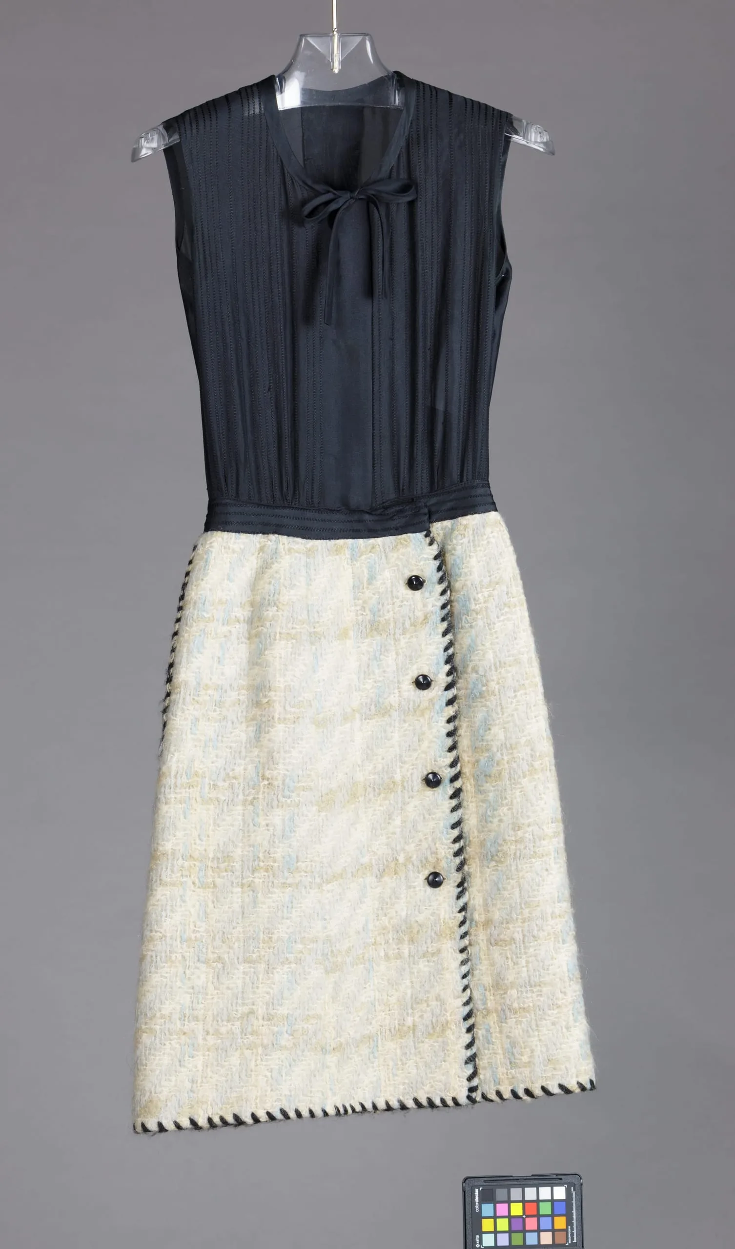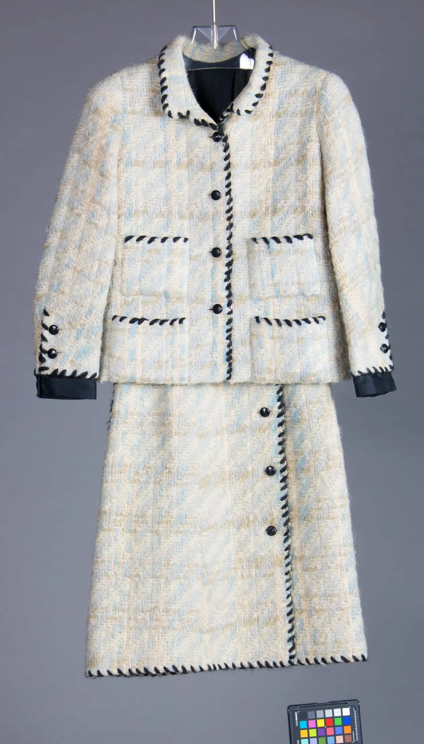 - a) Dress: Wool/mohair (boucle), wool embroidery, silk plain weave, silk machine embroidery, plastic buttons. b) Jacket: wool/mohair (boucle), wool embroidery, plastic buttons, silk.