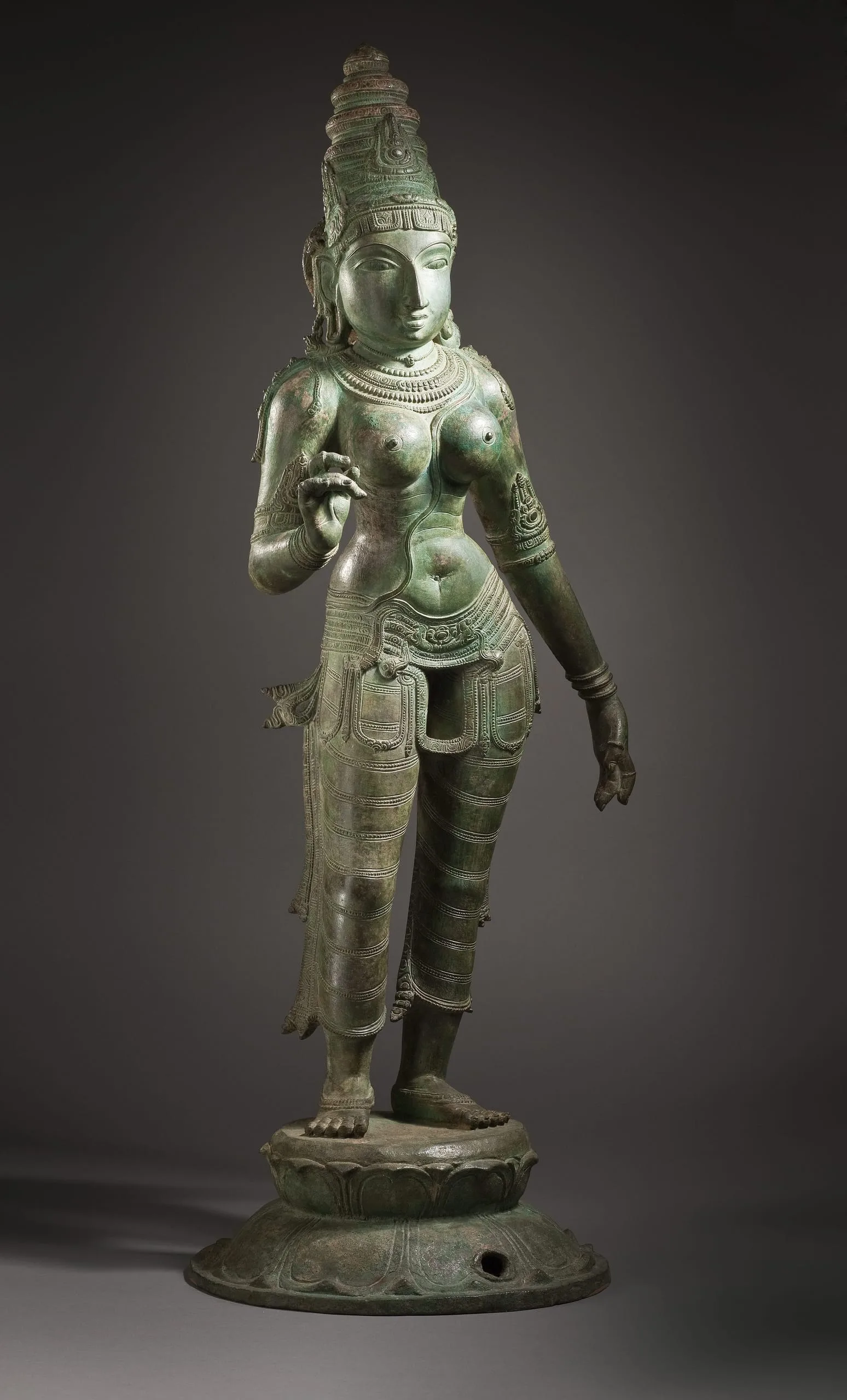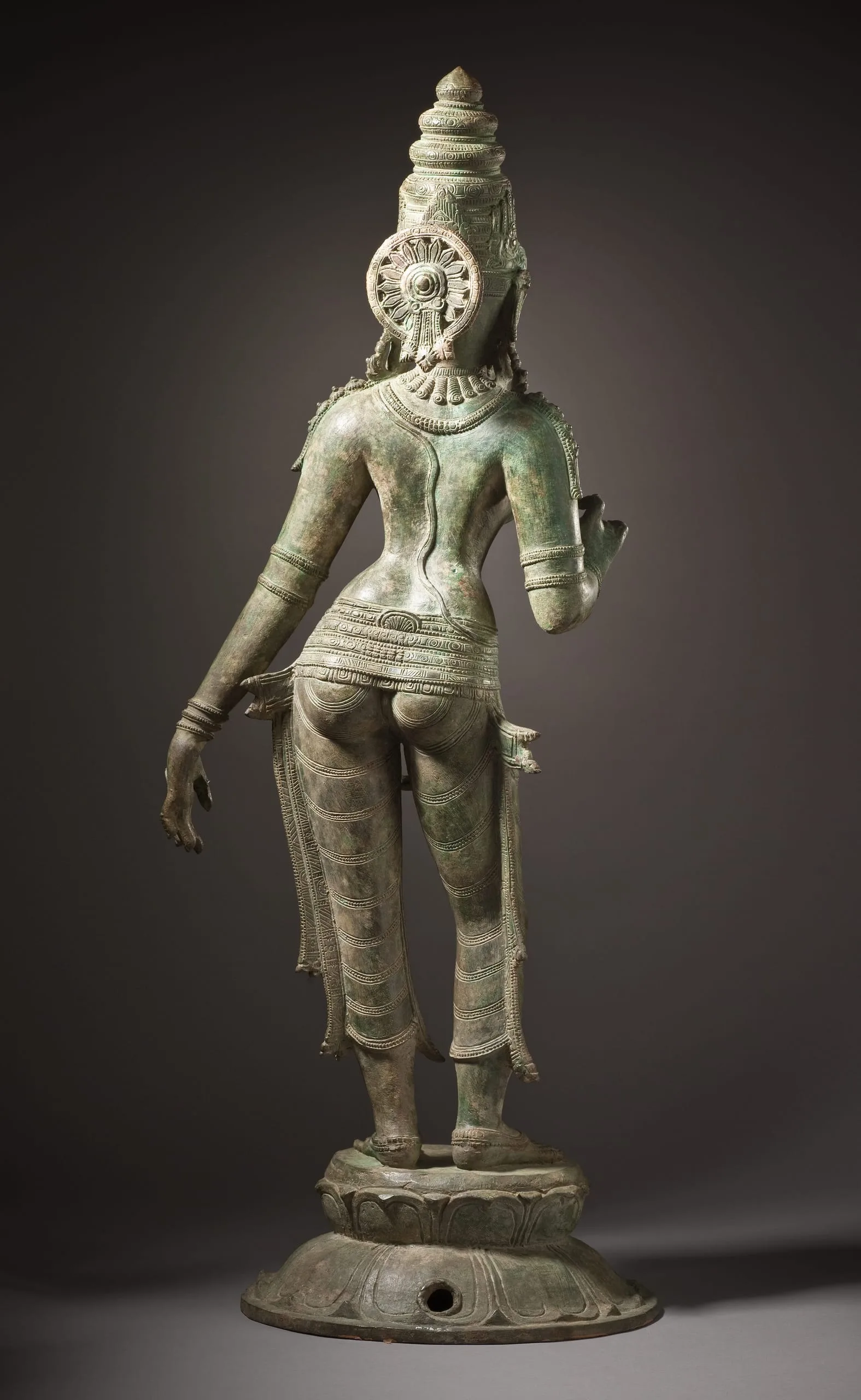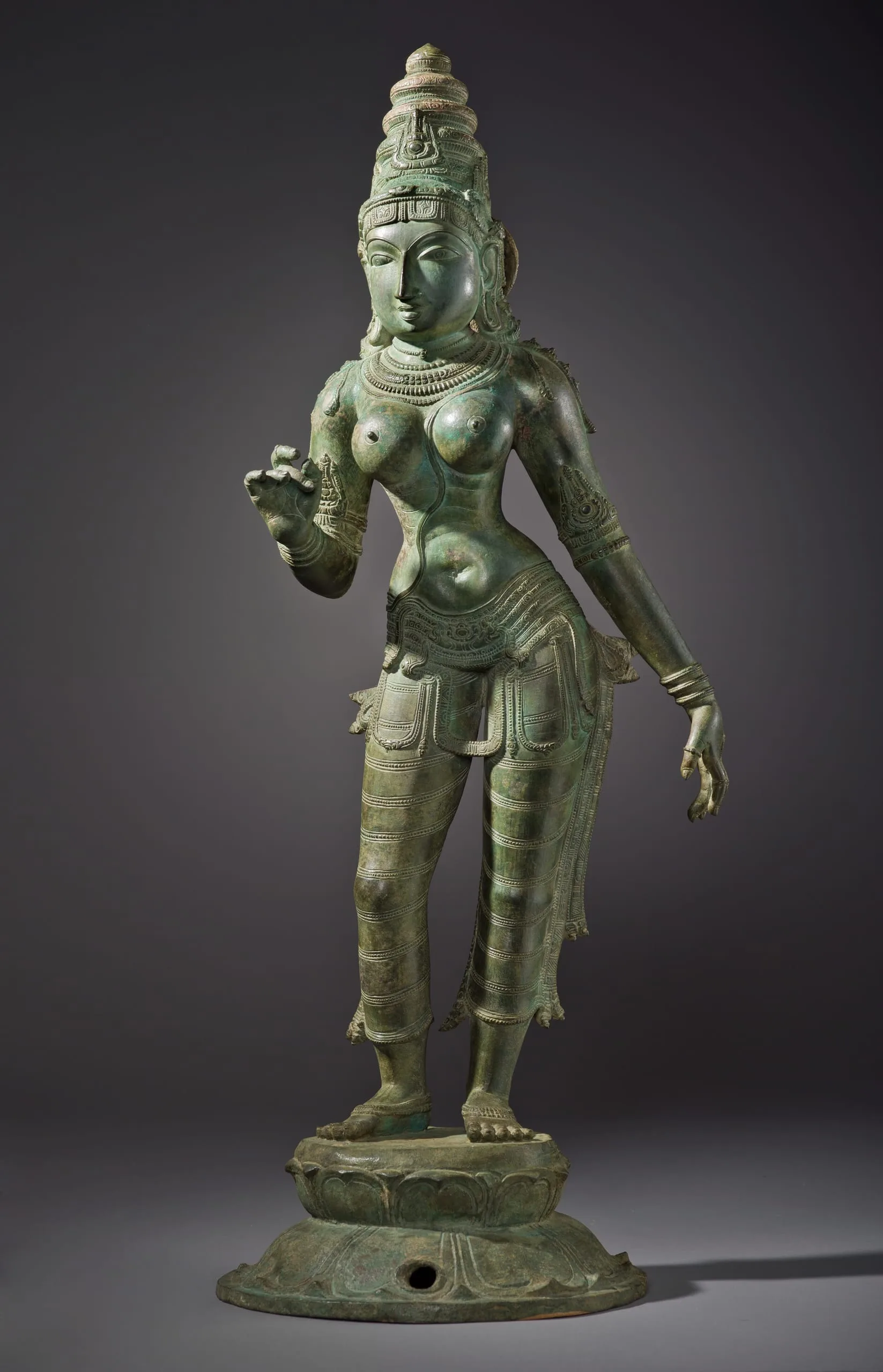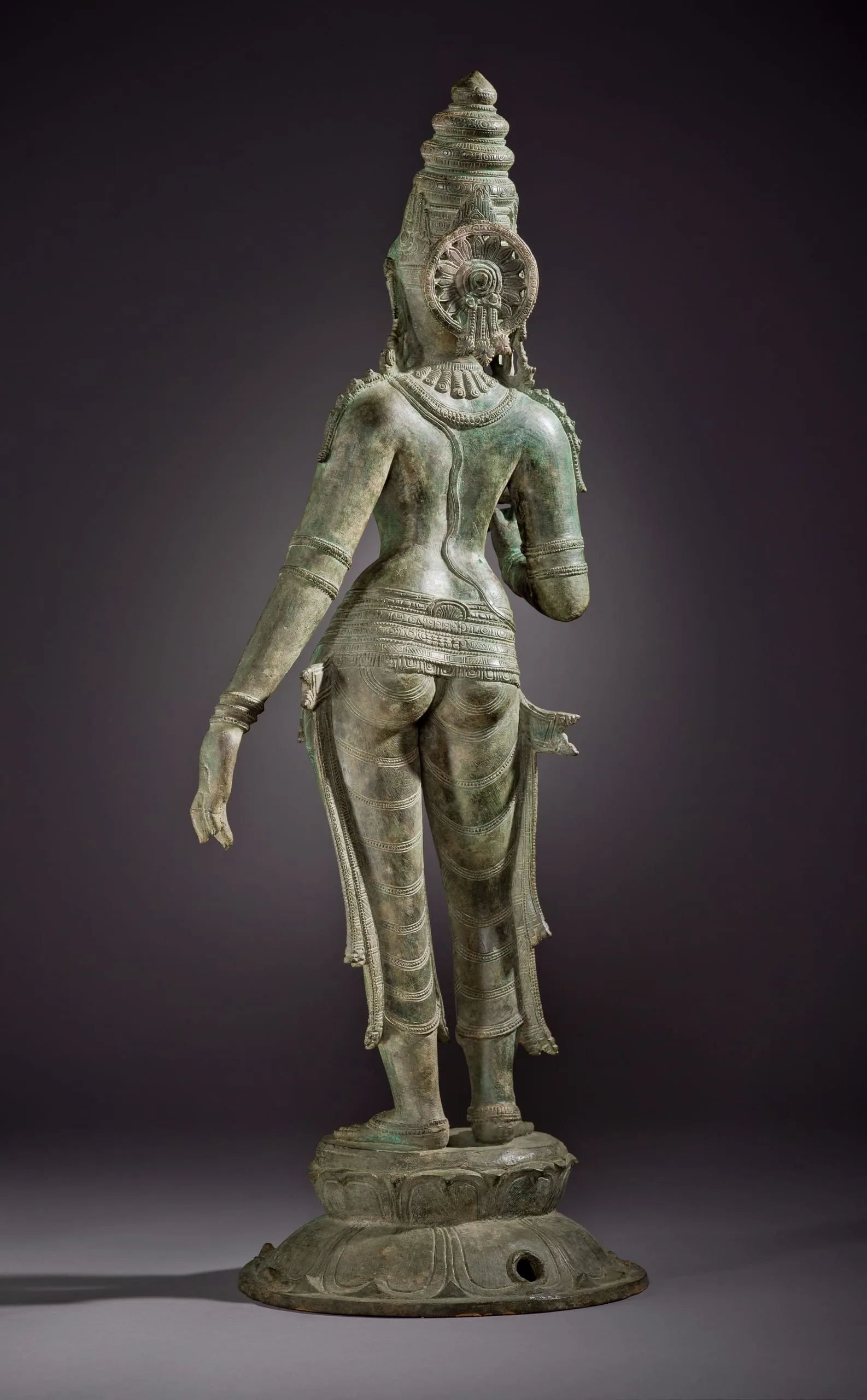 These separate copper alloy (bronze) representations of the Hindu god Vishnu flanked by his wives Shridevi (or Lakshmi) and the earth goddess Bhudevi form a Vaishnava matrimonial triad (M.70.5.1-.3). Originally made as processional images, each deity stands on a double lotus base cut with holes for attaching them to the support poles.