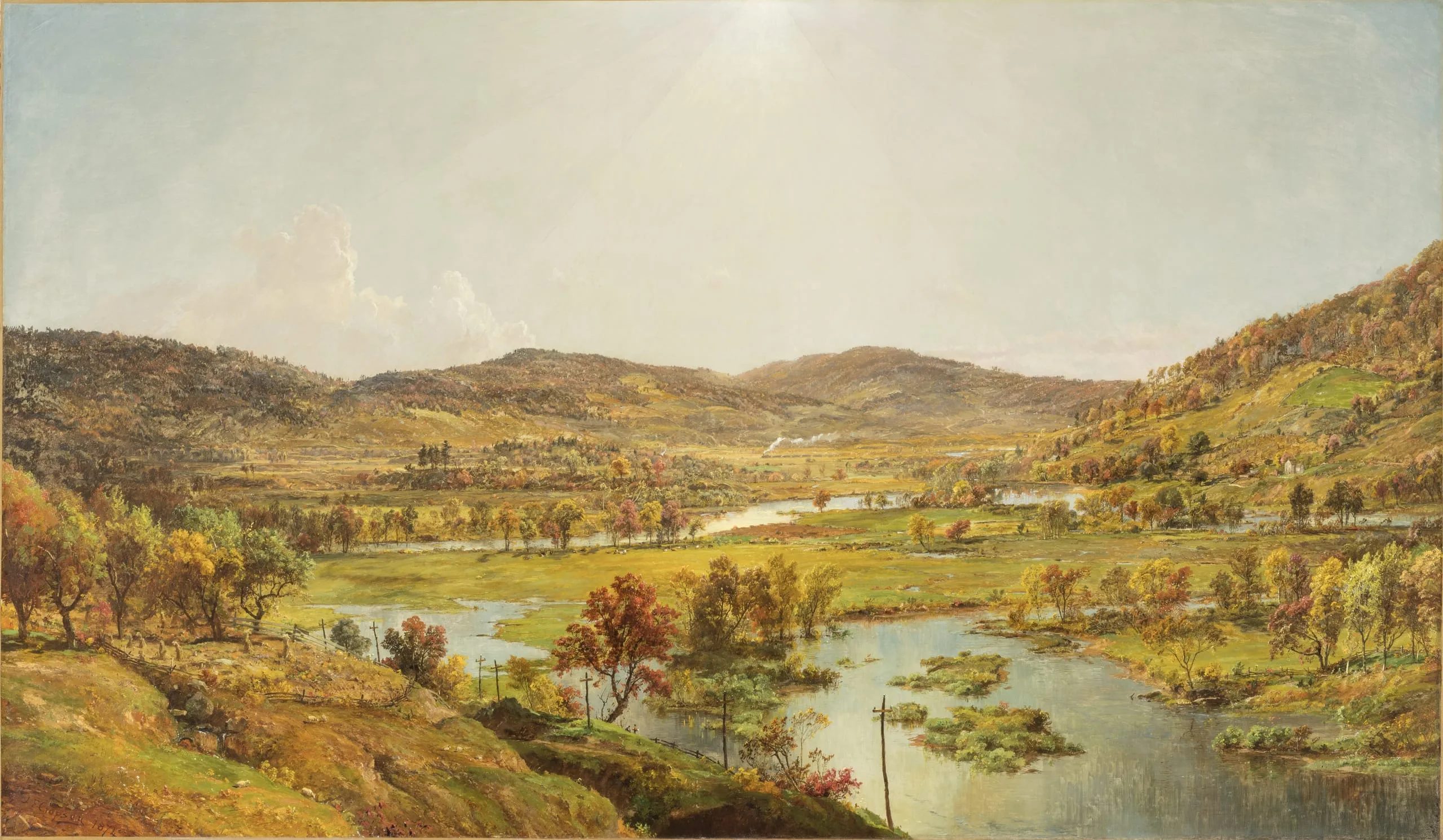 Sidney Plains is painted in Cropsey’s characteristic autumnal palette, which, according to the color notes written on the preparatory drawing, he found in nature. The sun breaking through the moist haze has the appearance of shafts of light. Although they can be explained as a natural phenomenon, these pearly hued rays imply a divine blessing on the land and its settlement.