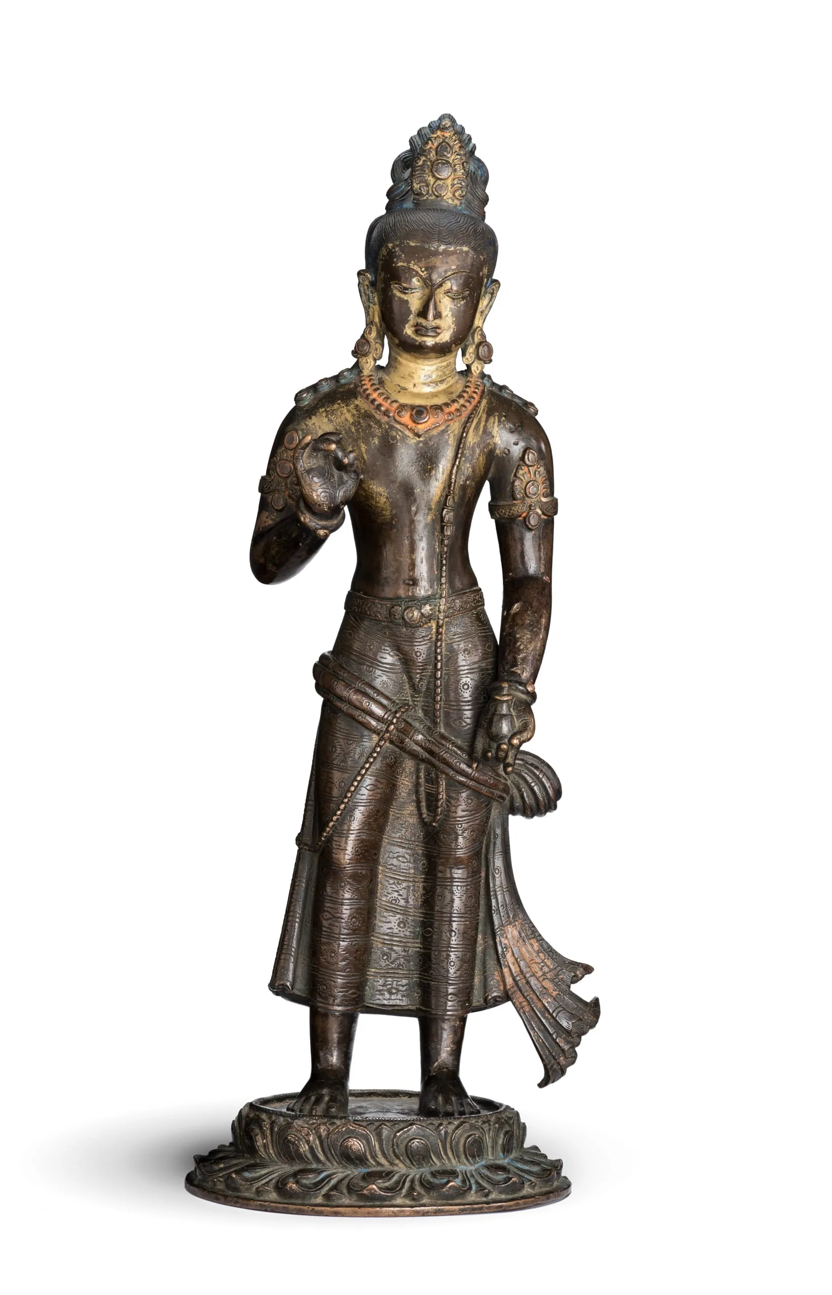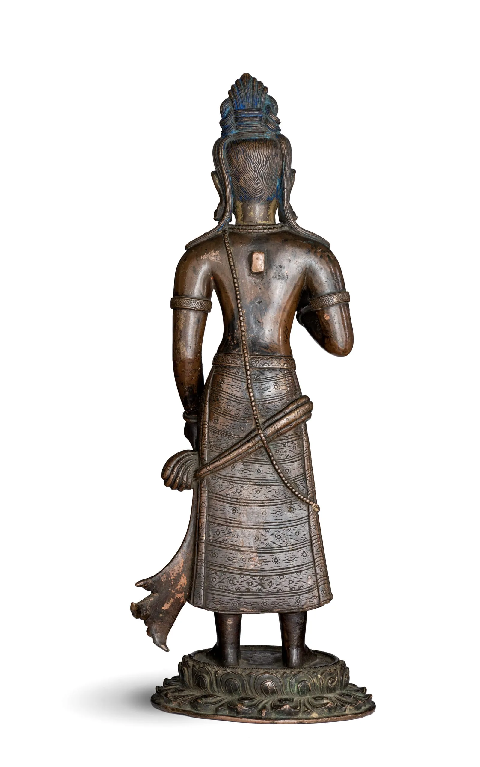 The future Buddha, Maitreya (Benevolent One), can be represented as a Buddha or as a Bodhisattva because before his manifestation on earth he is believed to live in Tushita Heaven as a Bodhisattva (one who postpones their own Enlightenment to assist all sentient beings in their quest for Enlightenment). Here, he is envisioned as a Bodhisattva wearing heavy jewelry, an exquisitely patterned dhoti, and a hip sash with flaring ends. His ascetic nature is indicated by his piled hair, the Brahmanical sacred thread (yajnopavita) worn over his left shoulder and hanging down to his right knee, and the mendicant’s water pot carried in his left hand. His right hand is held in the gesture of discourse (vitarka mudra). He is barefoot and stands on the lotus base. The image has traces of gold paint on his face, neck, and chest, as well as blue paint on his hair. Both features reveal that the sculpture was once under worship in a Tibetan monastery.