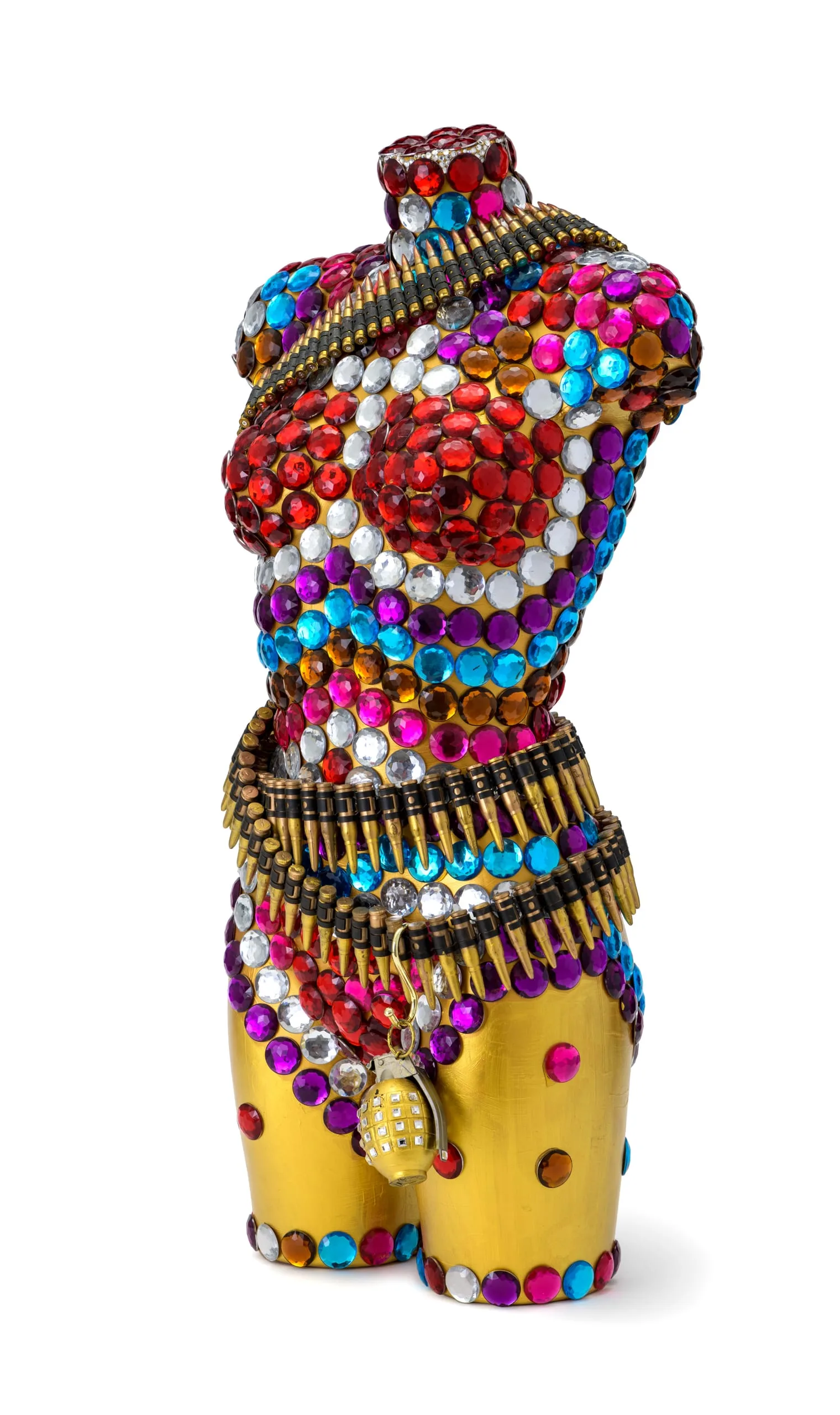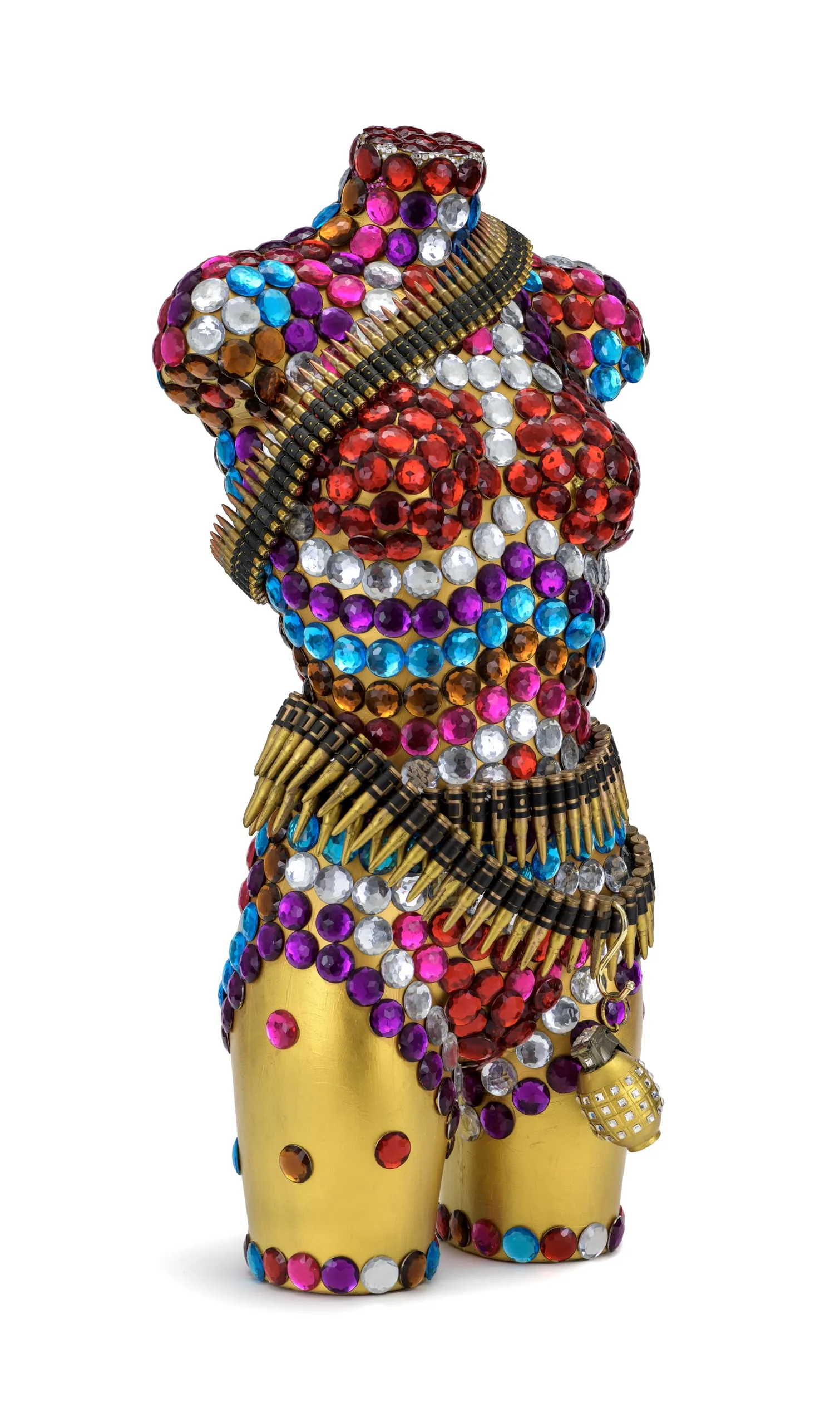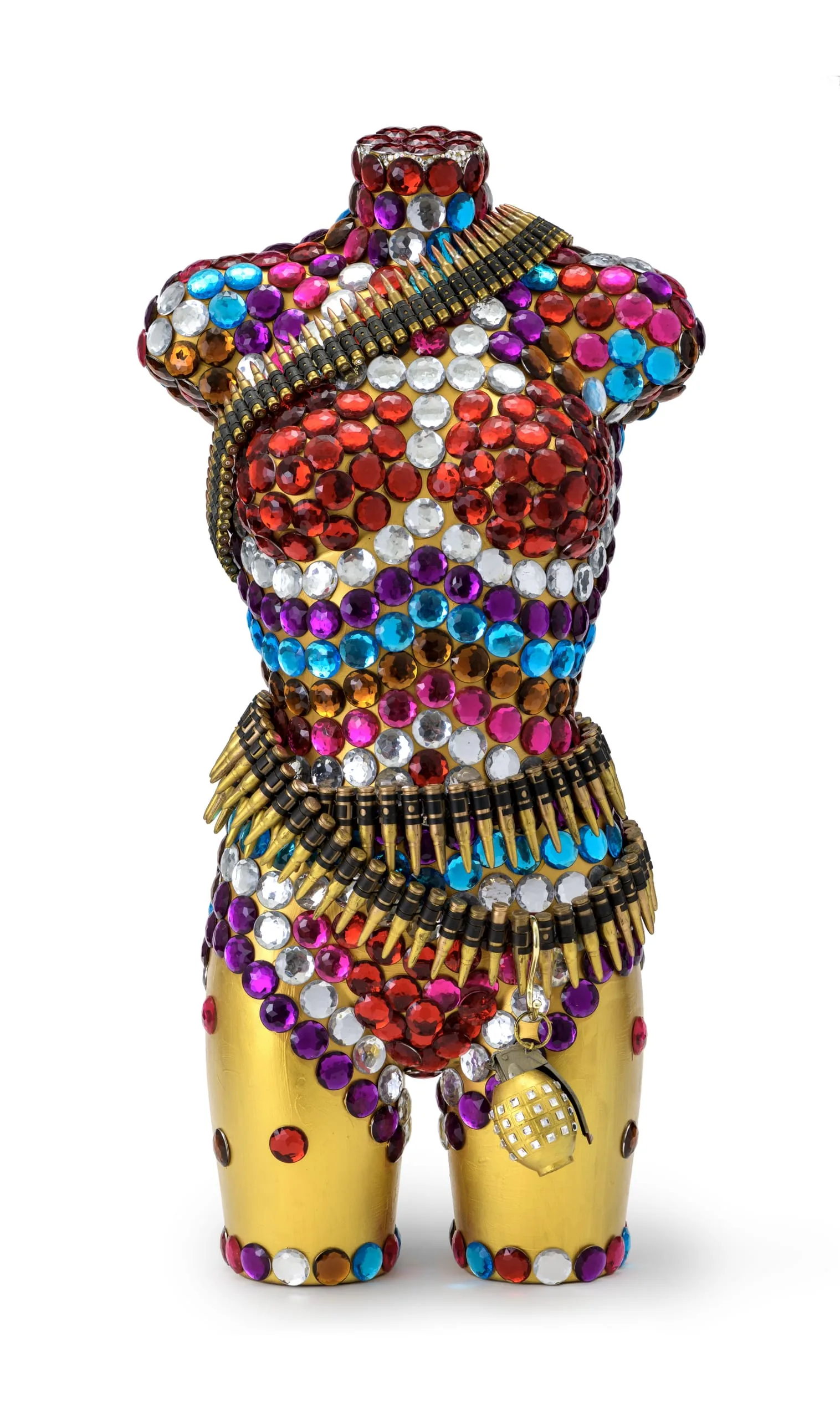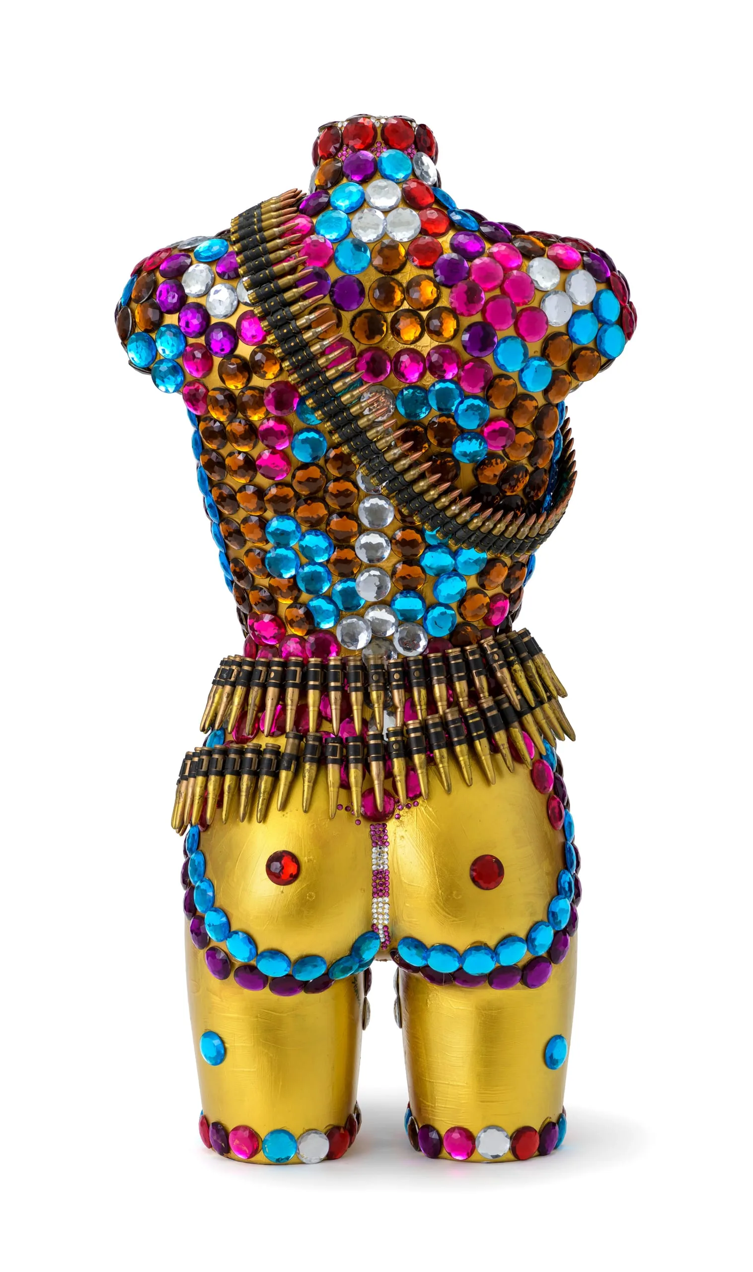 are bedecked with large, colorful rhinestones, black lace or peacock feathers, and weapons or ammunition—references but is not