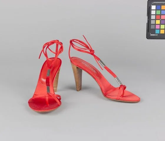 Pair of tomato-red strappy high-heeled sandals with stacked honey-brown heels, silver hardware accents, and long ankle-tie bows