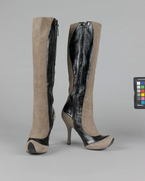 Pair of knee-high stiletto boots in warm gray suede and shiny black patent leather panels, with peep-toe openings and back zip closures