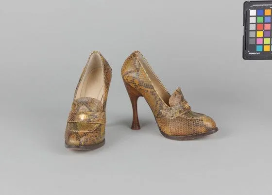 Pair of snakeskin stiletto loafers with amber, gray, and brown python patterning, chestnut-colored heels, and penny loafer saddle detail, displayed on gray background