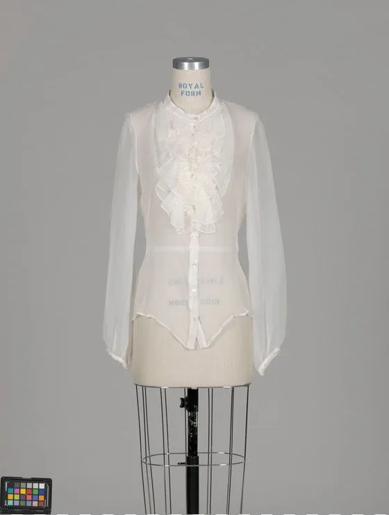 Ivory chiffon blouse with cascading ruffled front panel and long sleeves displayed on a cream dressmaker's mannequin against a gray background