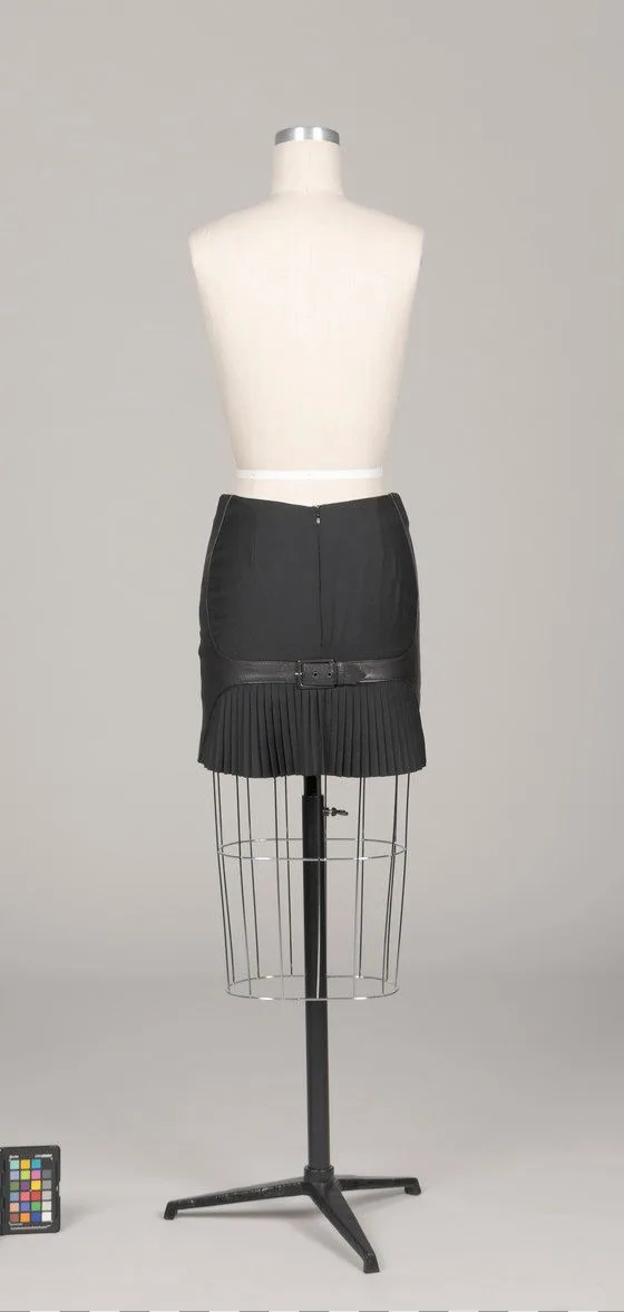 Black mini skirt on a cream dress form: smooth waistband, glossy hip belt with rectangular buckle, and deep pleated hem border