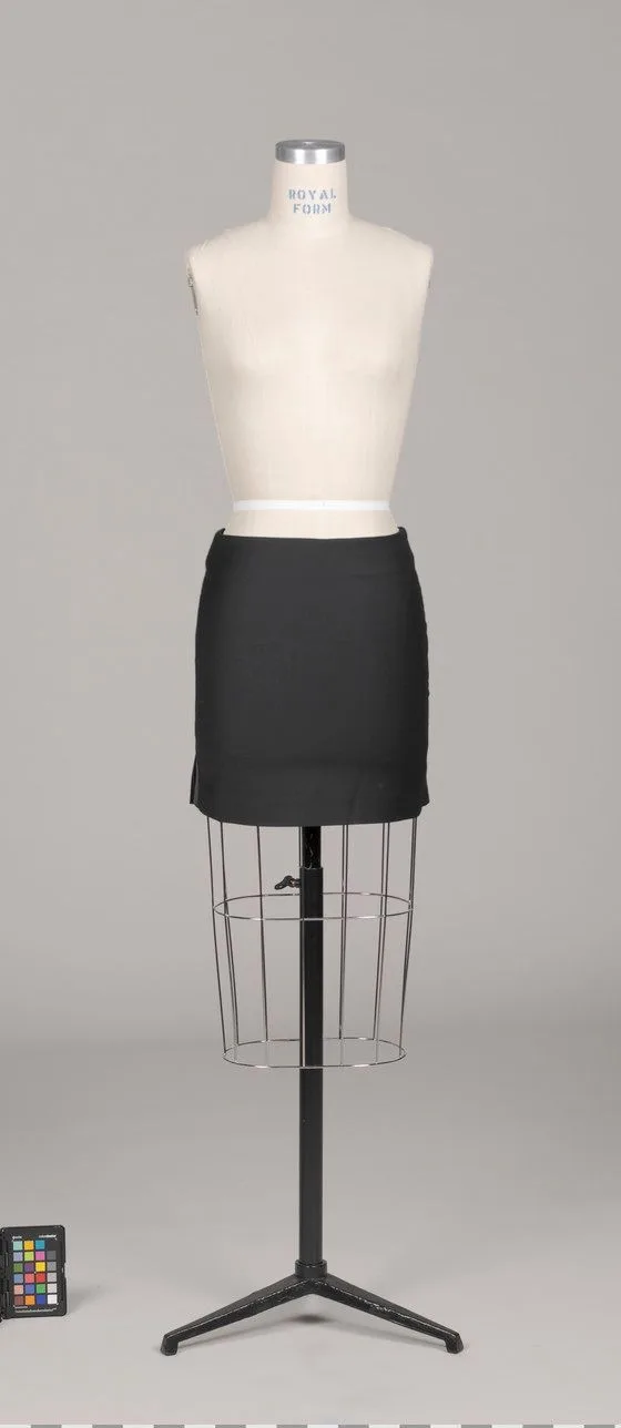 Black mini skirt displayed on a dress form mannequin with a wire cage base; straight silhouette in smooth matte fabric with a white waistband.