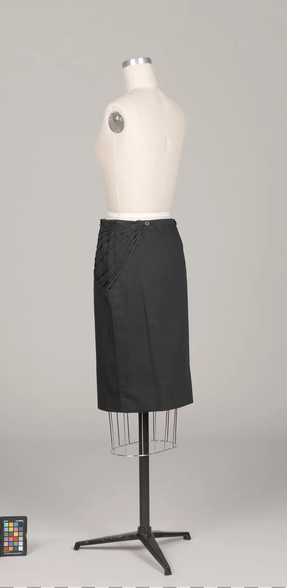 Black knee-length wool skirt on a cream dressmaker's form, with a raised diagonal lattice panel at the front hip