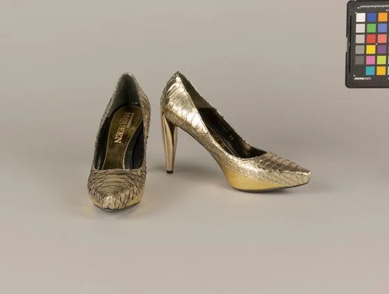 Pair of pointed-toe stiletto heels covered in metallic gold-bronze reptile skin with polished gold stiletto heels, displayed on a gray surface