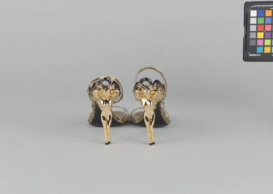 Pair of gold-toned stiletto sandals viewed from behind, with sculptural floral or foliate heel forms in mirror-polished metallic finish against a gray background