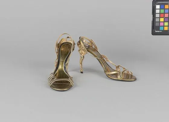 Pair of gold metallic stiletto sandals with open-toe strappy construction and sculptural heels featuring organic, curvilinear forms; one shoe shown from the front, the other in profile.