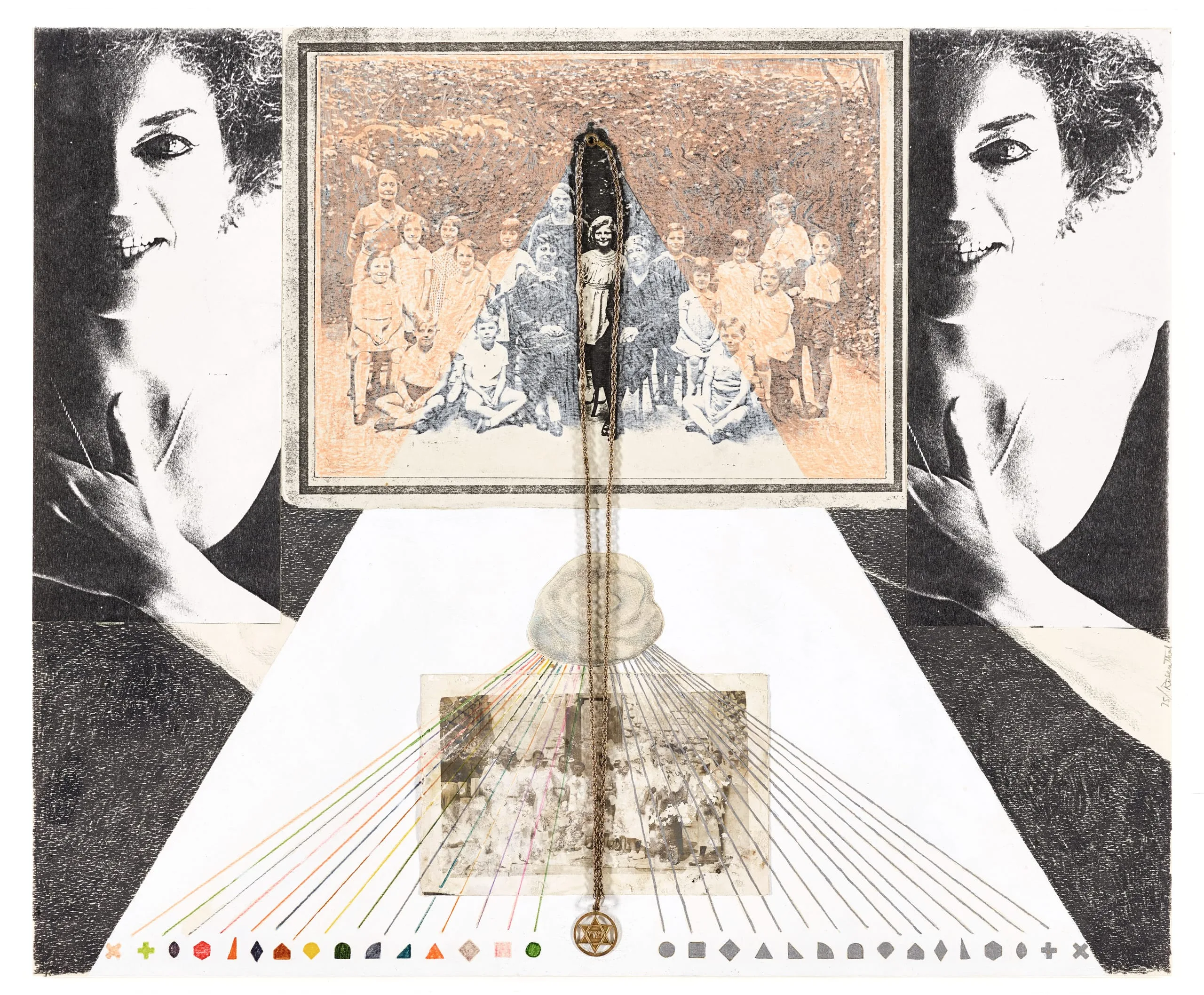 - Collage of photocopies and gelatin silver print with graphite, colored pencil, and gold-plated metal chain with pendant on paper