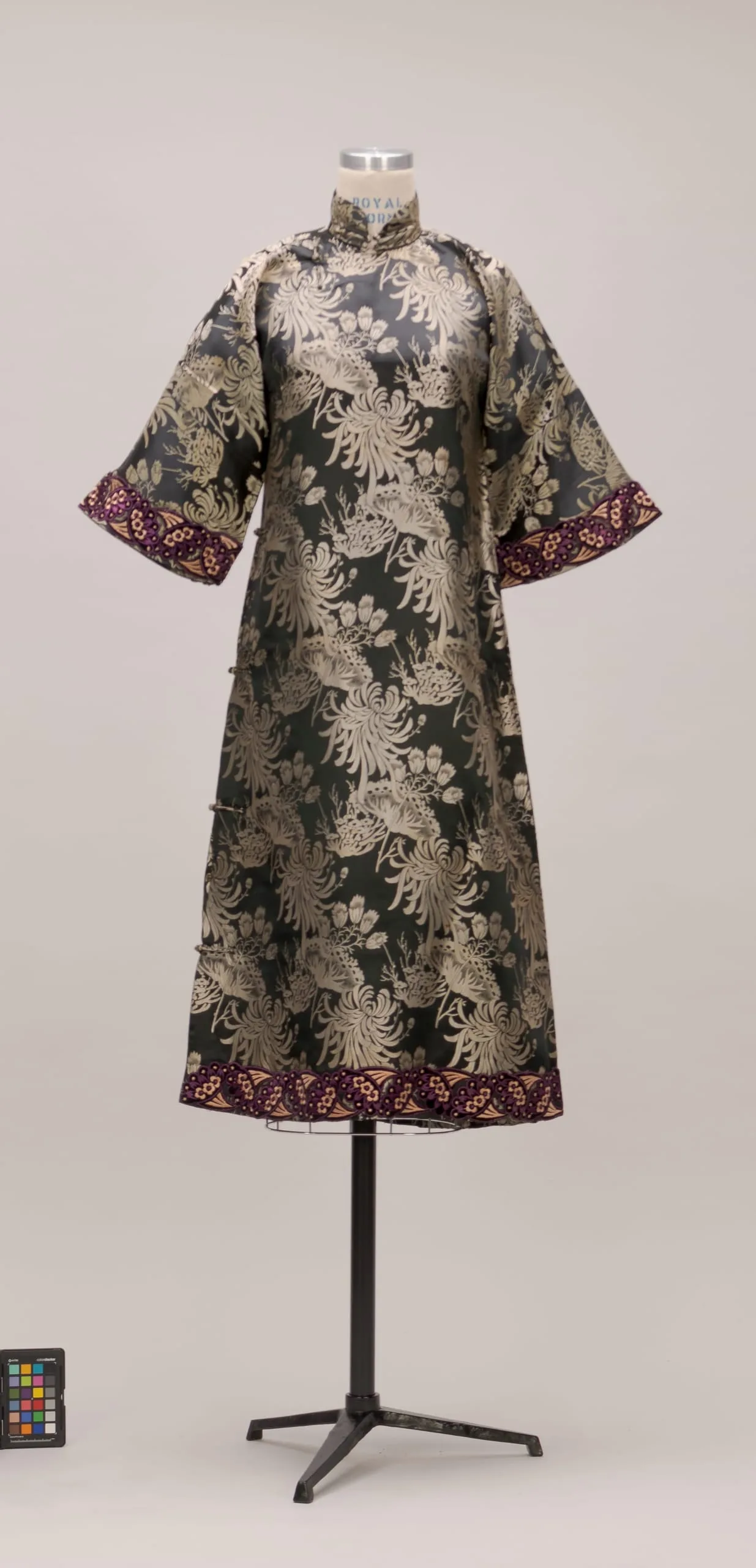 - Silk twill weave with self-weft patterning; self frog (huaniu) closures and silk embroidered velvet appliqués