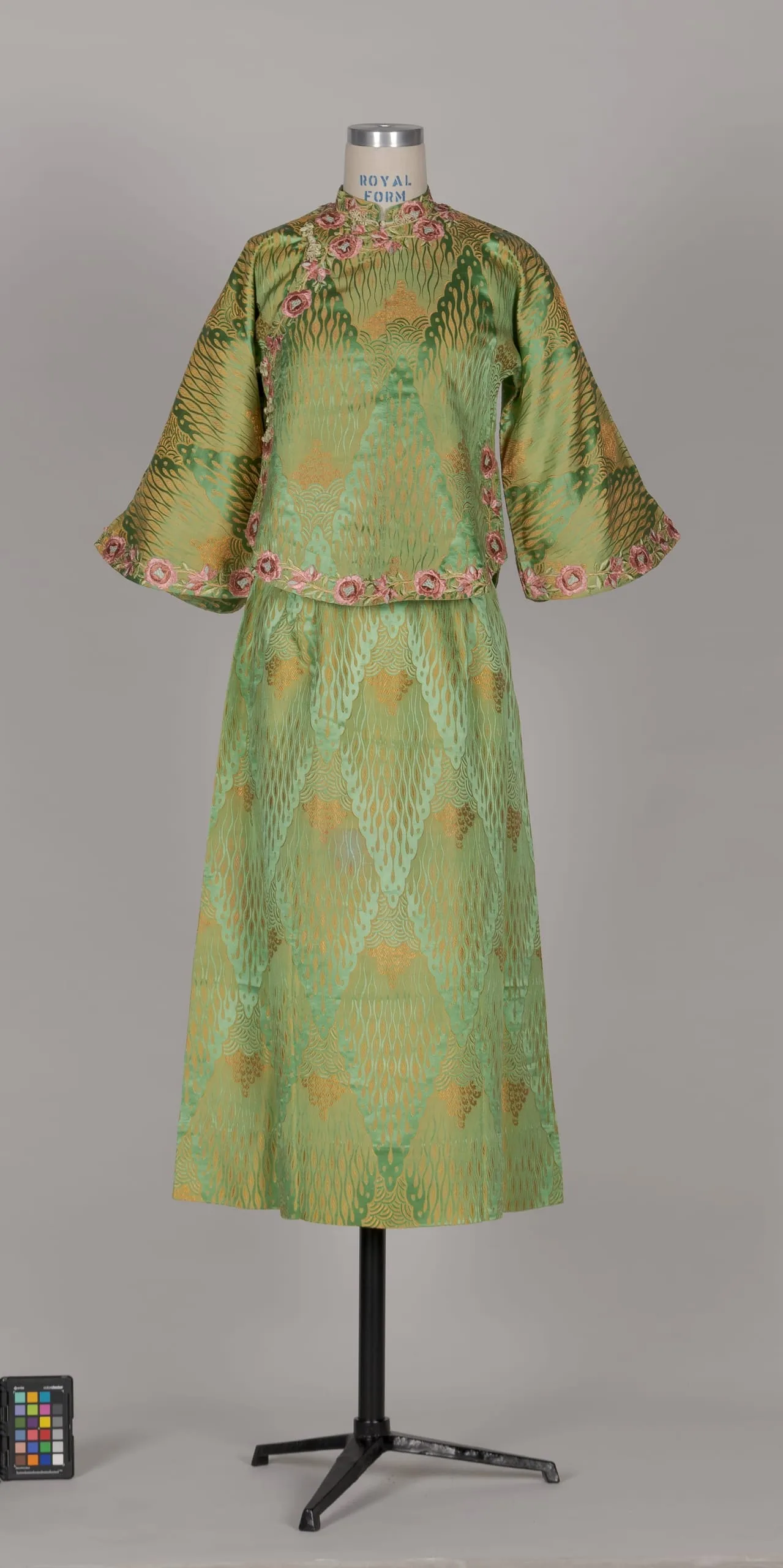 - Silk jacquard weave; silk embroidered appliques and silk satin frog (huaniu) closures