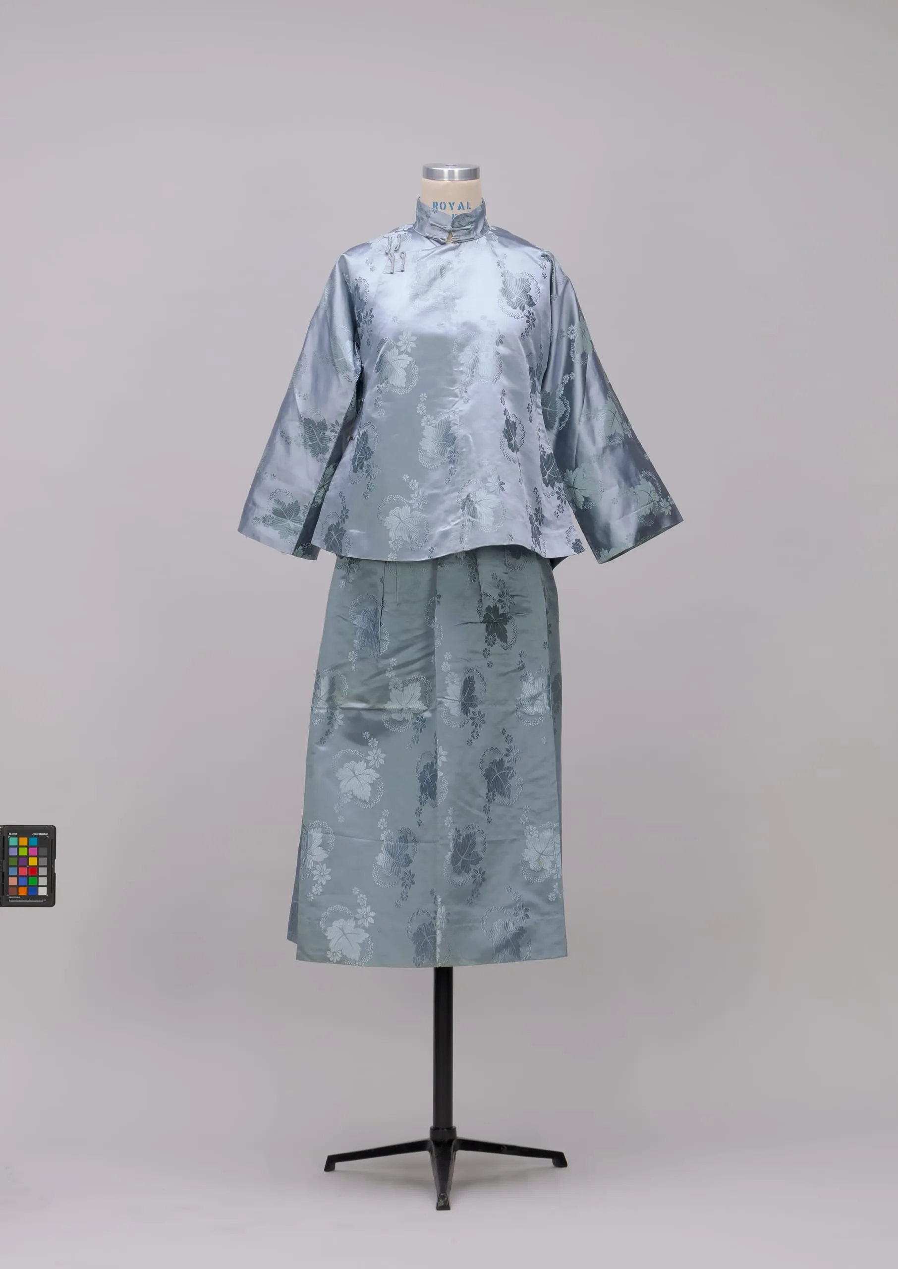 - Jacket: Silk twill with weft patterning; Skirt: Silk twill with weft patterning and cotton plain weave