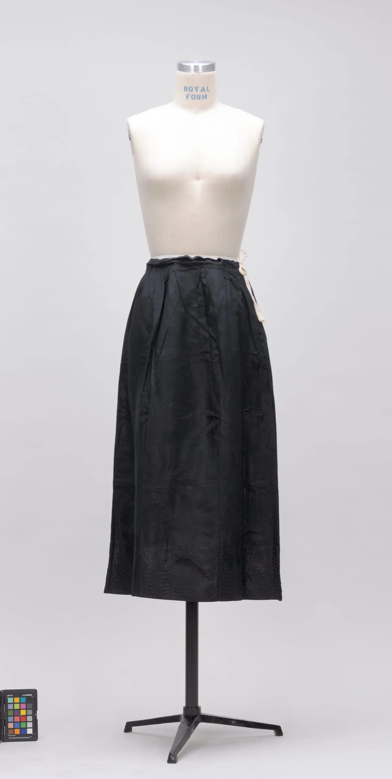 Black mid-calf-length skirt with slight sheen and cutwork embroidery near the hem, displayed on a cream dressmaker's form on a black tripod stand