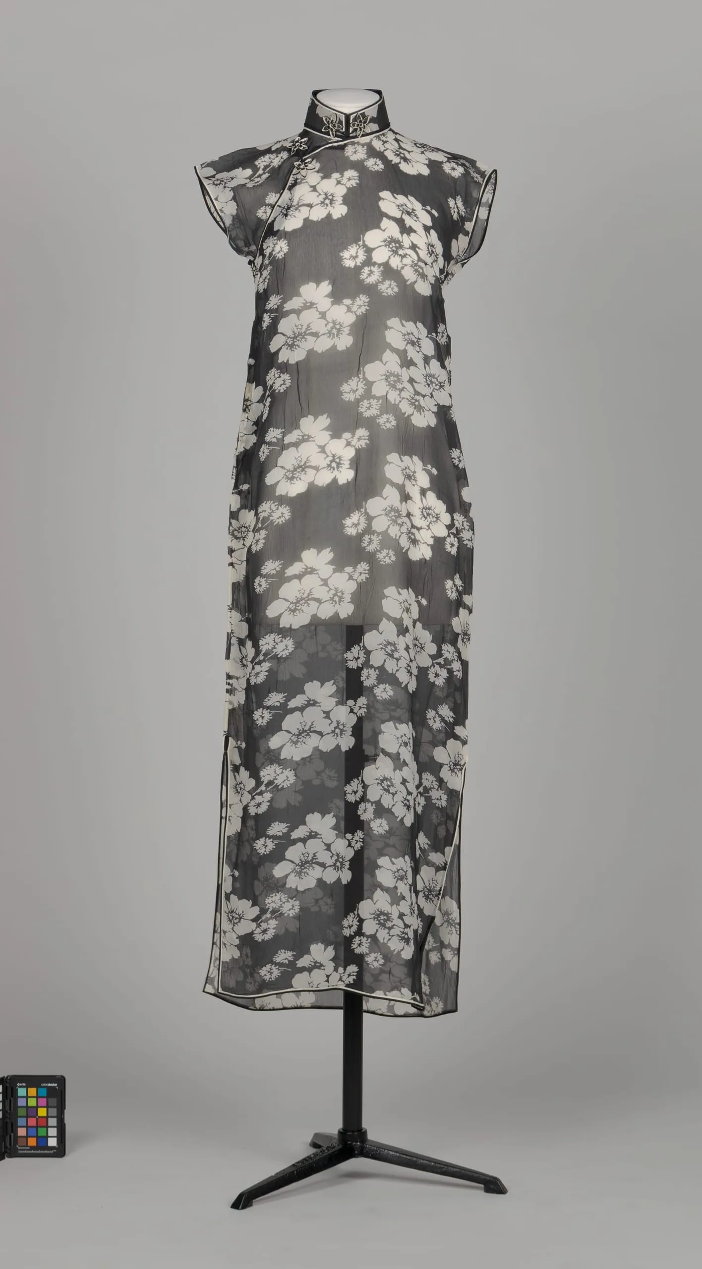 - Silk plain weave (crepe chiffon), printed, with silk satin trim and frog (huaniu) closures