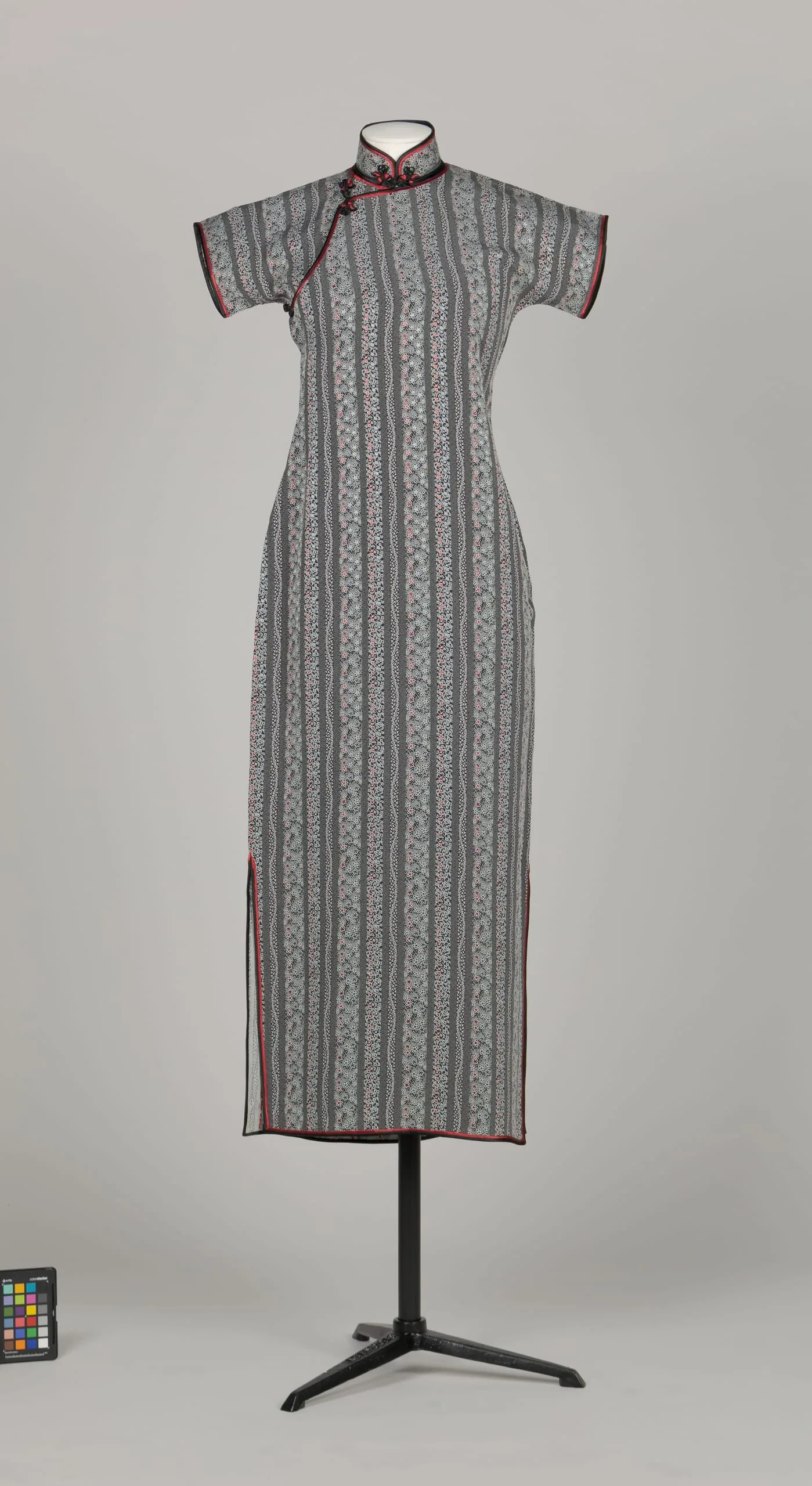 Full-length qipao displayed on a black dress form, gray and white vertical floral stripe fabric with crimson trim and frog closures at the collar