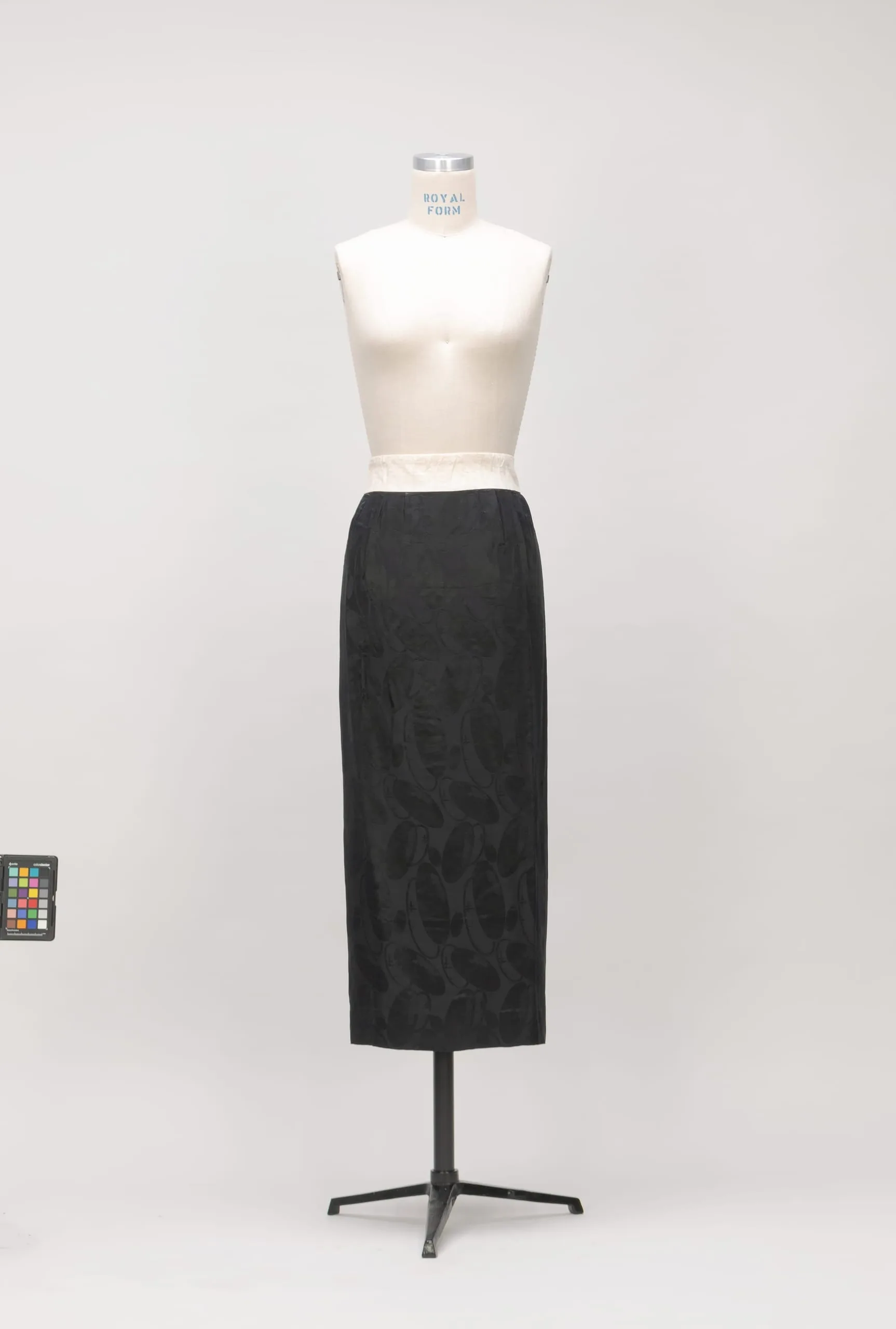 Straight, floor-length black jacquard skirt with tone-on-tone patterning displayed on a cream dressmaker's mannequin against a gray background