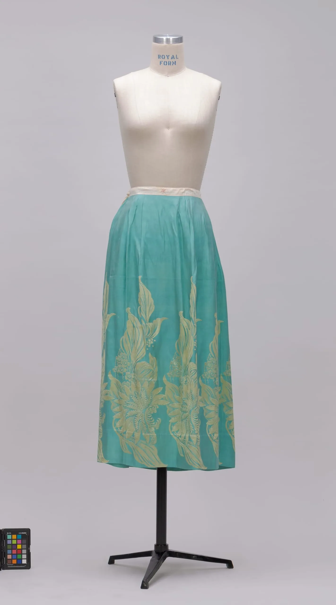 Aqua-turquoise midi skirt on a cream dress form, with a chartreuse and cream botanical border pattern along the lower half