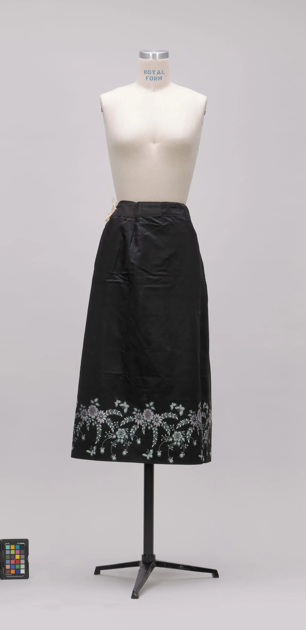 Black midi skirt with a straight silhouette on a dressmaker's form, with a band of white floral and leaf embroidery along the hem