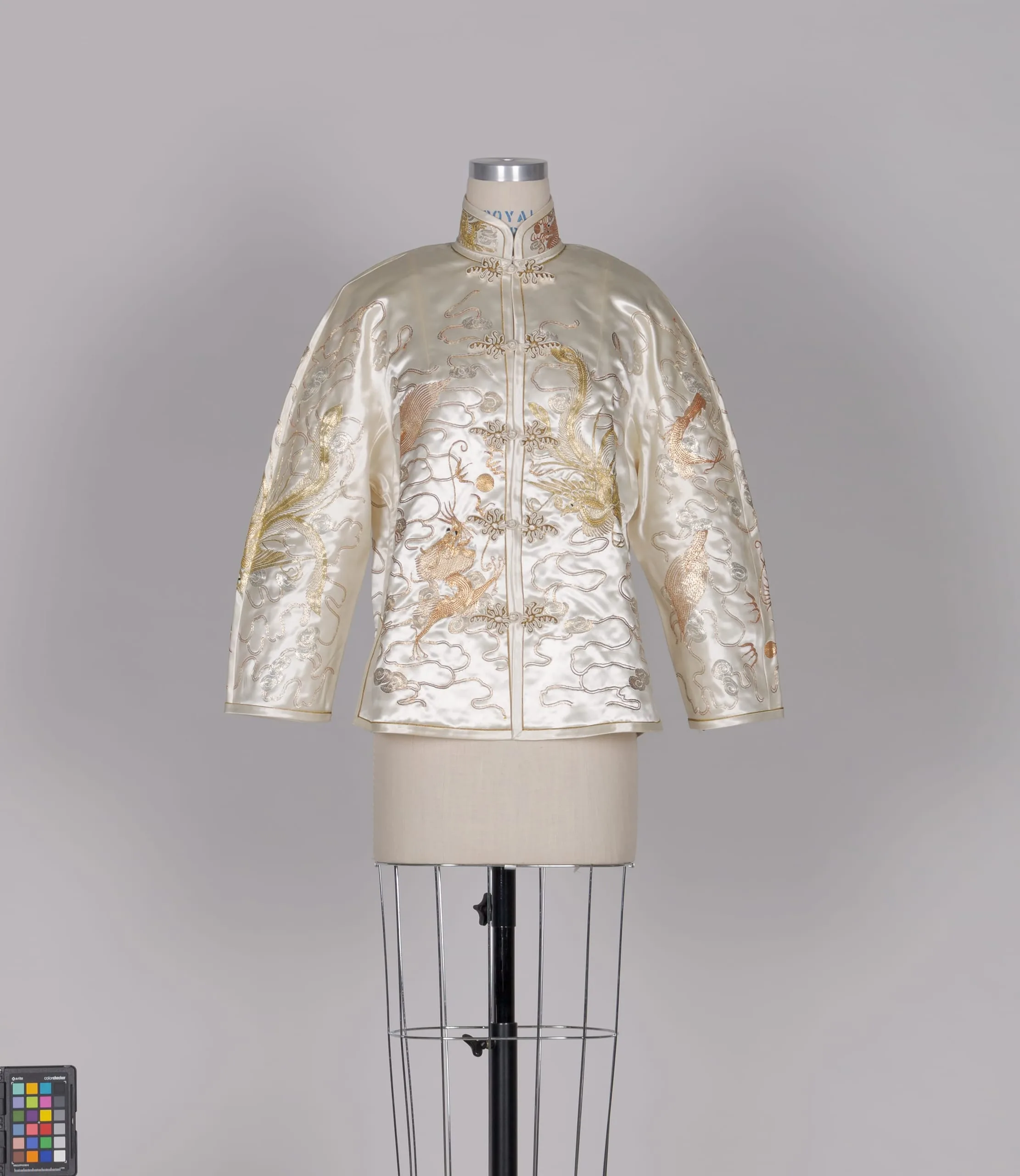 - Silk satin with metallic-gilt-paper-wrapped-silk thread embroidery with silk satin and silk and metallic thread braid